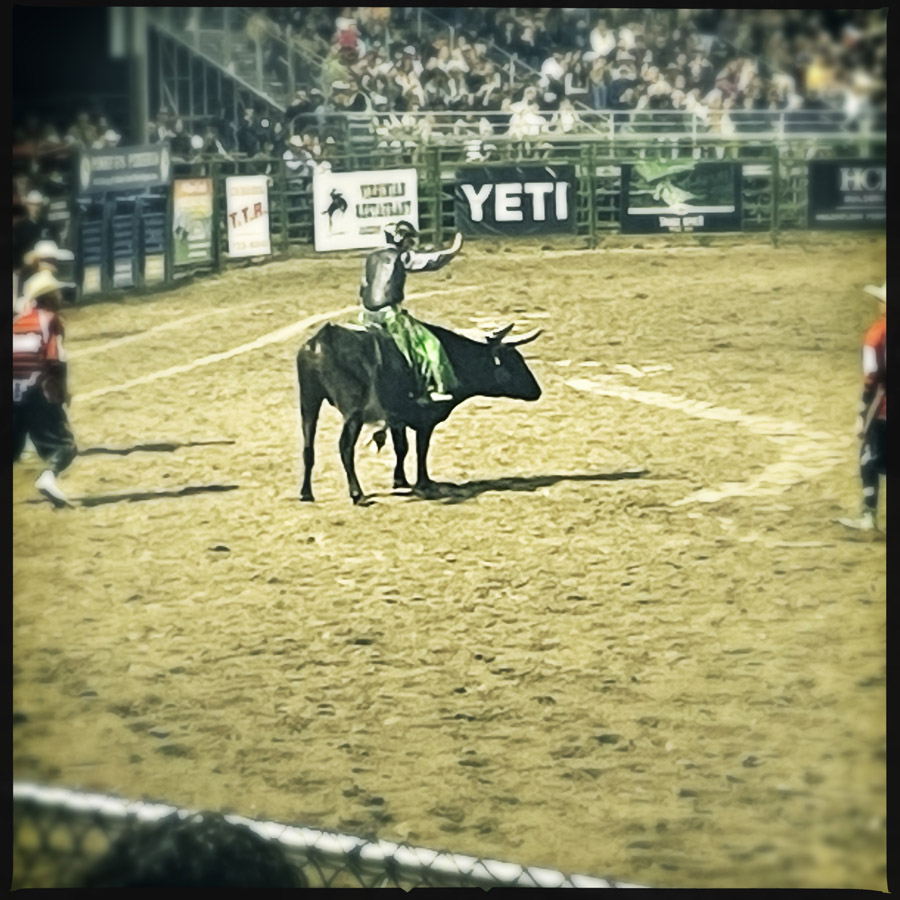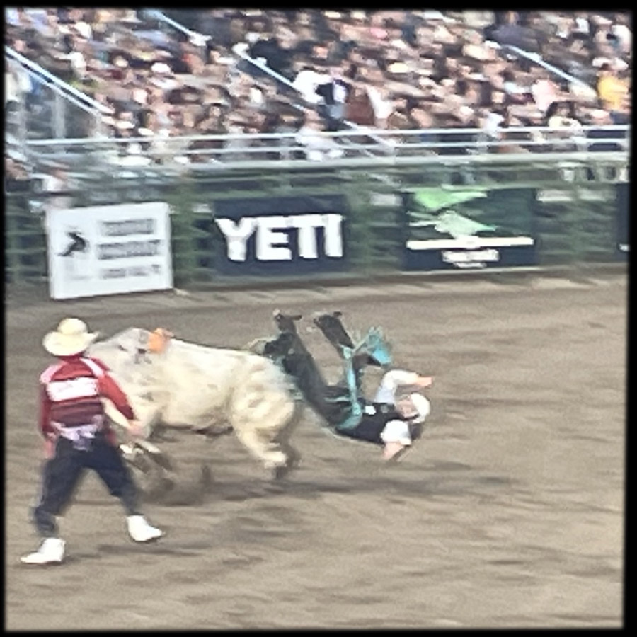 Quand c’est au tour des taureaux, il y en a un qui fout le cowboy par terre fort et ensuite fait deux tours de pistes à la cool, et foutant des coups au passage à ceux qui essayent de le faire rentrer dans le box.