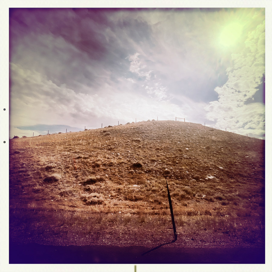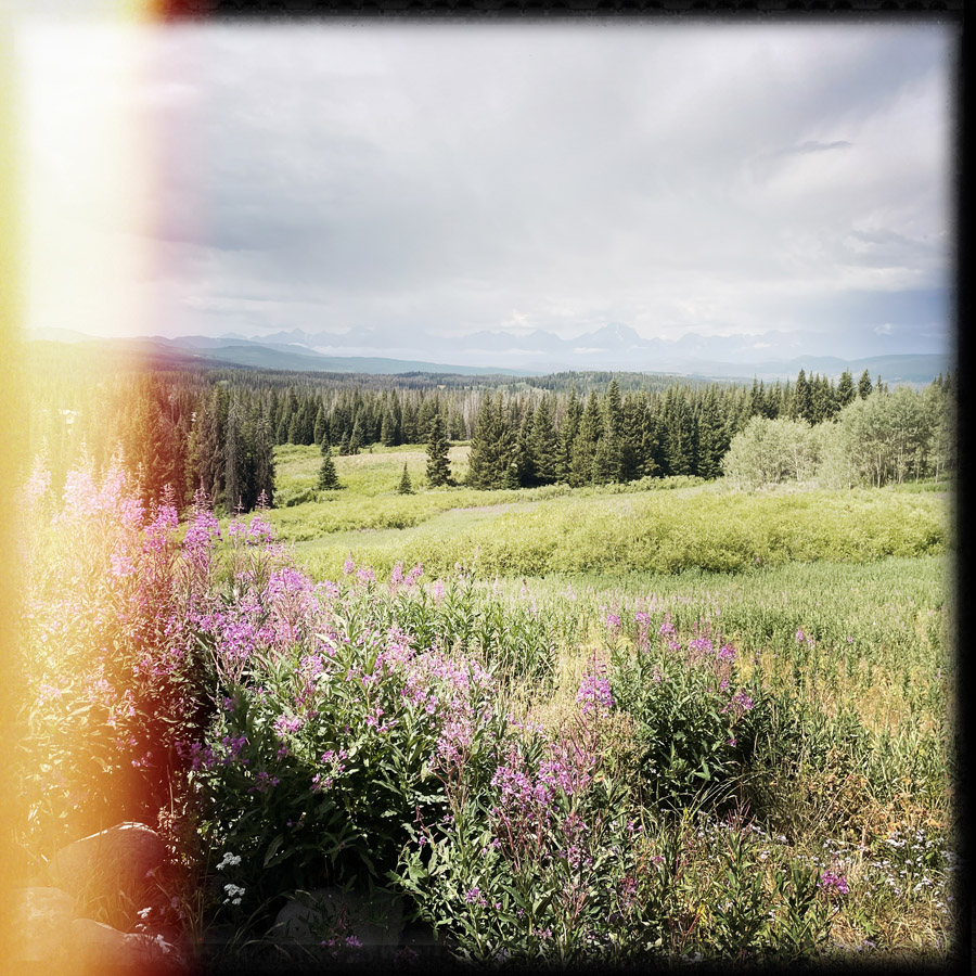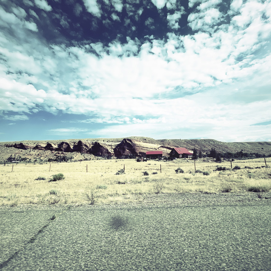 Le paysage d’hier démarre avec merveilleux déjà vu d’hier, c’est jaune et sec, et il fait beau. Petit à petit, comme un coup de baguette magique, des gros rochers rouge sortent de terre. Et puis, c’est de plus en plus vert. On passe très des grandes entrées de ranch, des grandes arches en bois avec un nom super « Willow creak ranch » « Sanctuary Ranch » « Whispering Pine Ranche » etc. Partout des cheveux, des vaches.
