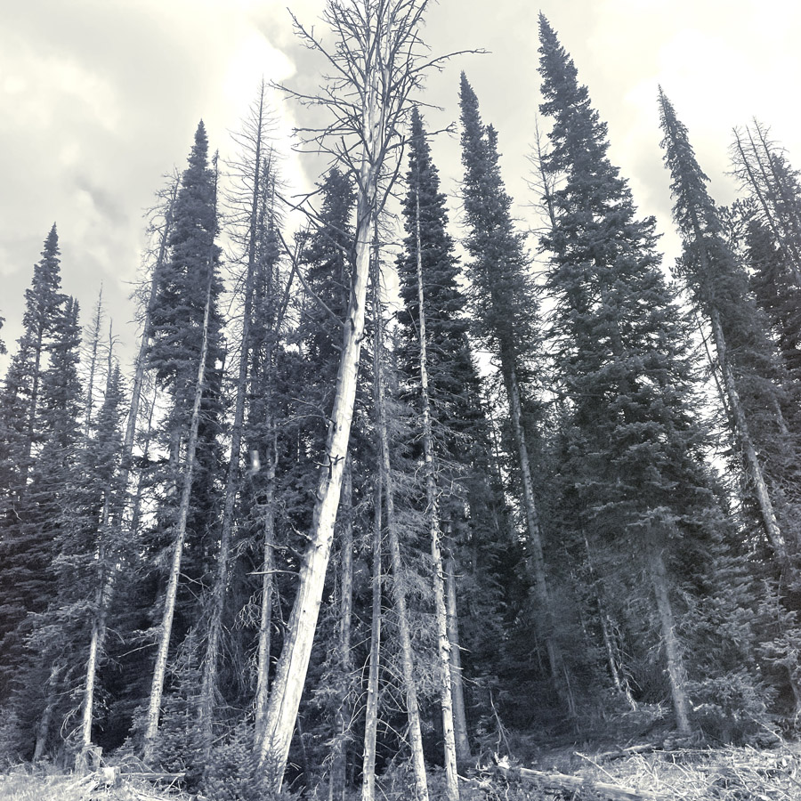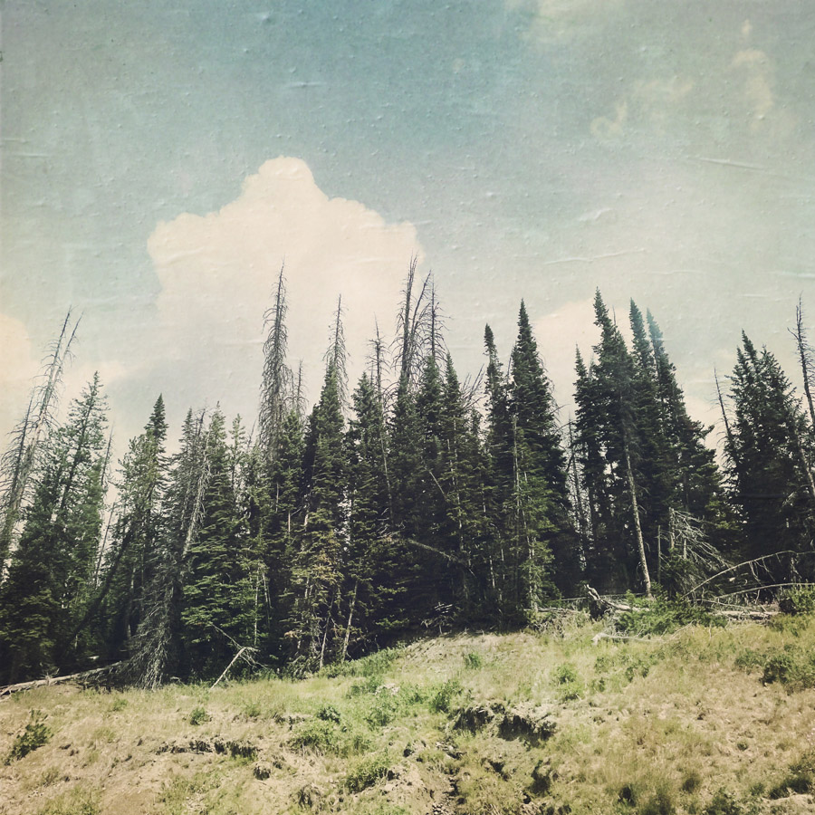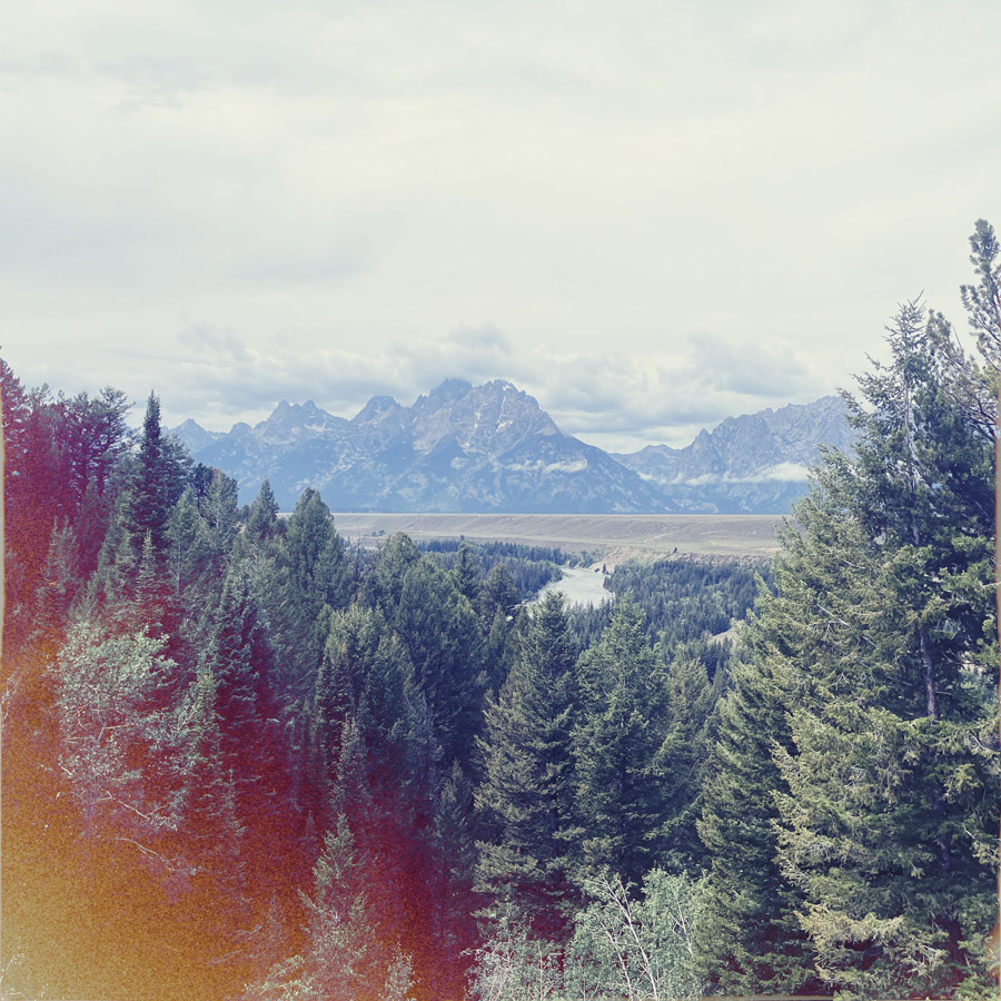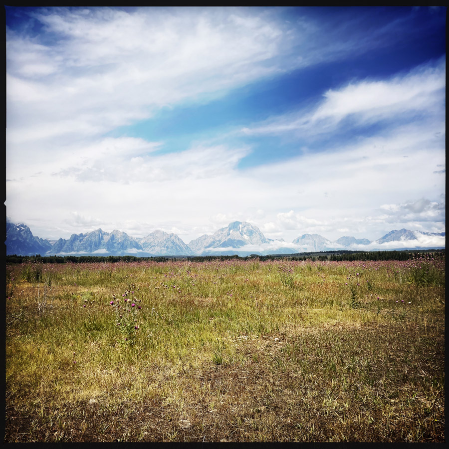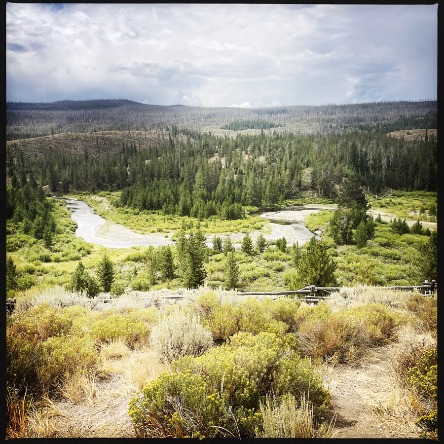 Dans le lointain se profile le Teton National Park. On grime de plus en plus, la forêts des pins pointus est partout. Les sommets se perdent dans les nuages. (et oui Manu a fait des blagues sur le nom du parc).