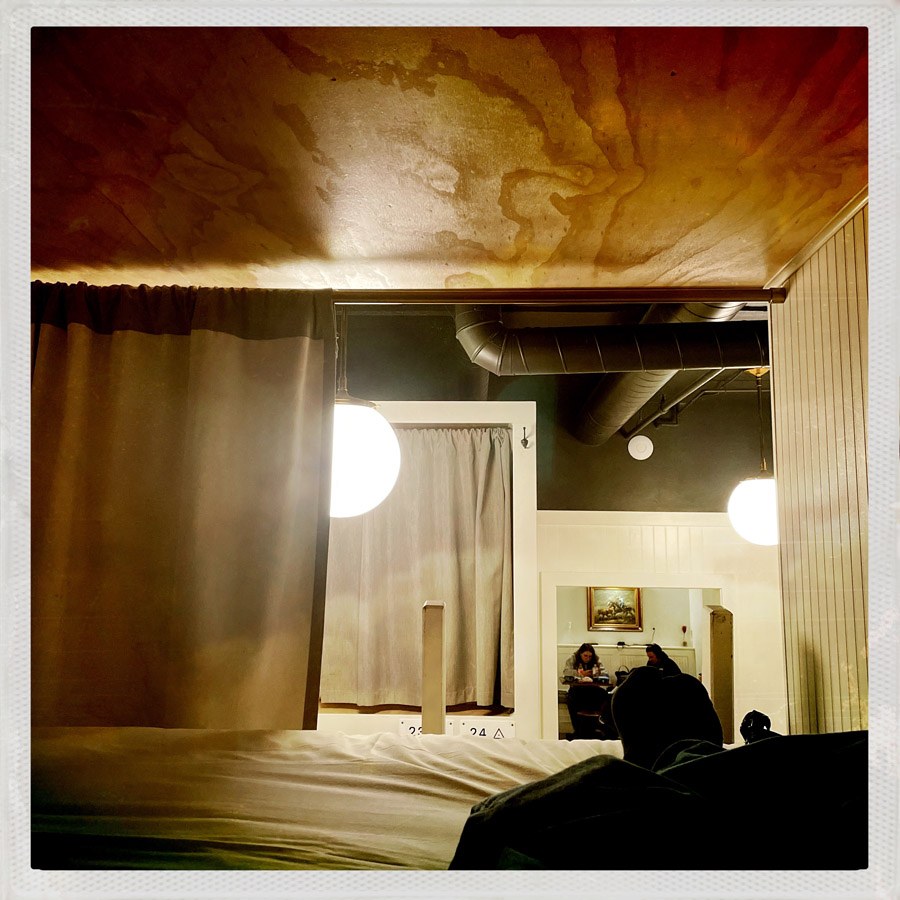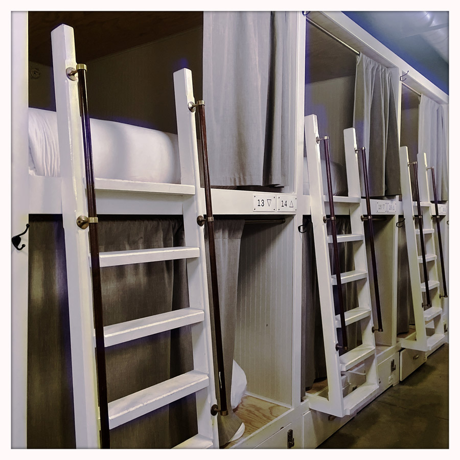 Huhu, je savais que c’était étonnant, mais quand même. En gros, c’est une auberge de jeunesse gentrifiée. Après les formalités d’usage, on nous indique un escalier qui descend depuis la rue. Une porte avec un pass magnétique. Un espace commun, avec des canapés et des fauteuils, un couloir de douche, avec béton ciré au sol, et le couloir de lits. Des genres de box à rideaux. Un lit au dessus, un lit en dessous. On a tous un casier au numéro qui correspond à notre lit. Et un autre casier sous le lit où on trouve des serviettes de toilettes.