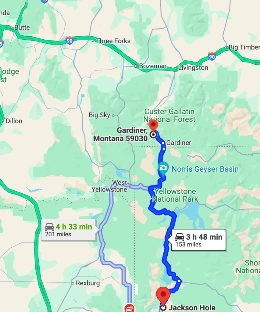 Je regarde notre trajet pour le Airbnb du soir. Le monsieur donne des instructions à partir d’un bled, alors direction d’abord le bled, qui s’appelle Bozeman. Je fais le point trajet maintenant. Mais ma stratégie a été nulle. En fait, je n’ai pas vérifié avant, le point sur la carte de notre destination finale. J’ai mis le GPS sur la ville de départ indiqué par Monsieur Airbnb. En me disait, ça doit être à 15mn.