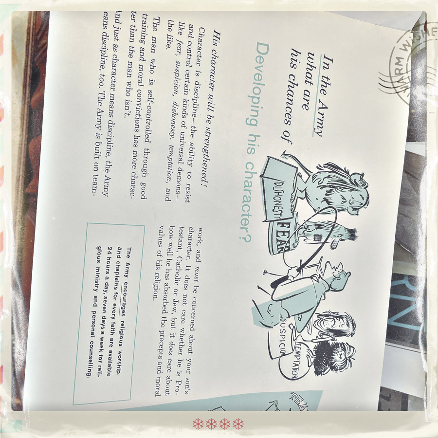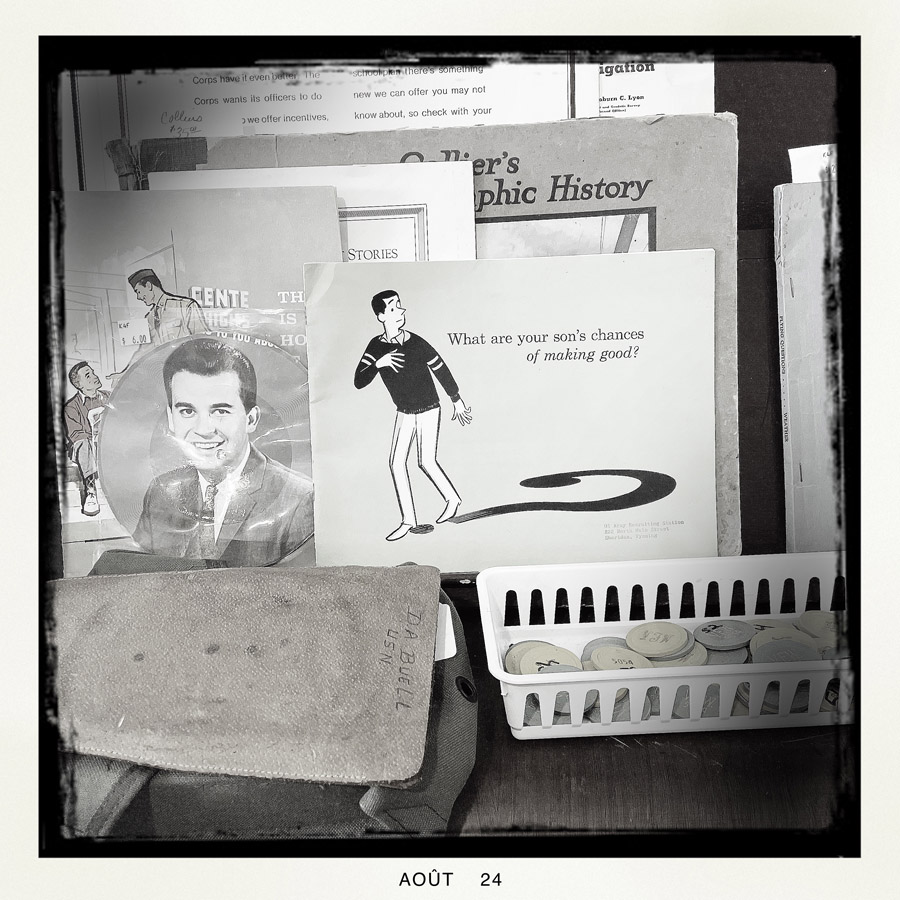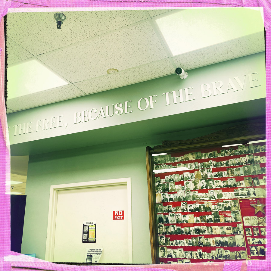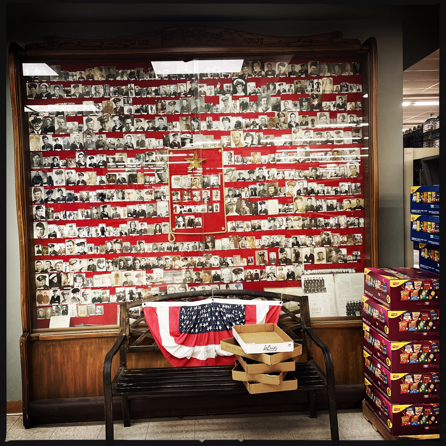 Elle va dans les rayons, ouvre un sachet de salade, mets du fromage rapé, quelques tomates cerise, et un sachet de vinaigrette ranch. Pendant qu’elle prépare tout ça, je découvre un grand mur des soldats envoyés au front de la seconde guerre mondiale. Dans un supermarché. C’est très étonnant. Je la remercie chaudement, elle doit me trouver bien enthousiaste pour une salade verte (et en plus, il me reste des fraises, ça va être super).