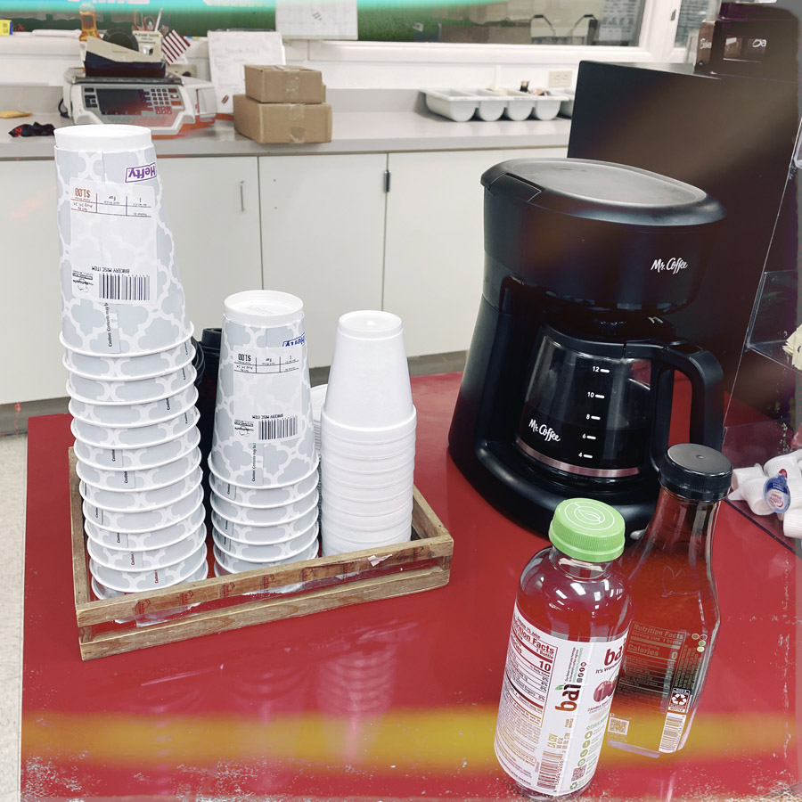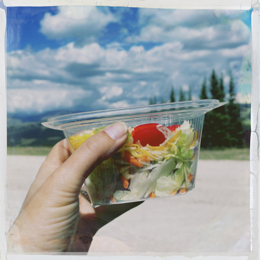 On s’arrête aussi dans un petit supermarché d’une petite ville. Pas de salade sans mayonnaise. J’ai l’air désemparé, et Manu demande à une petite dame si ils ont de la salade-salade. Elle dit que non, mais qu’elle peut m’en faire une. OH ?