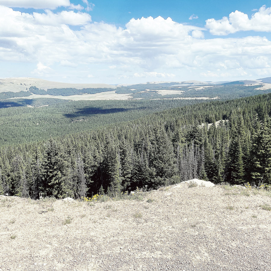 Ça monte et ça descend, c’est très beau, il y a des pins partout, avec des trous de forêt parfois. Sur la dernière ligne, ça monte surtout. Fort. On peine un peu mais on arrive à la Medicine Wheel (et c’est là qu’on regrette de ne pas savoir quoi faire parce qu’un petit coup de pouce à nos vieux muscles aurait bien été utile).