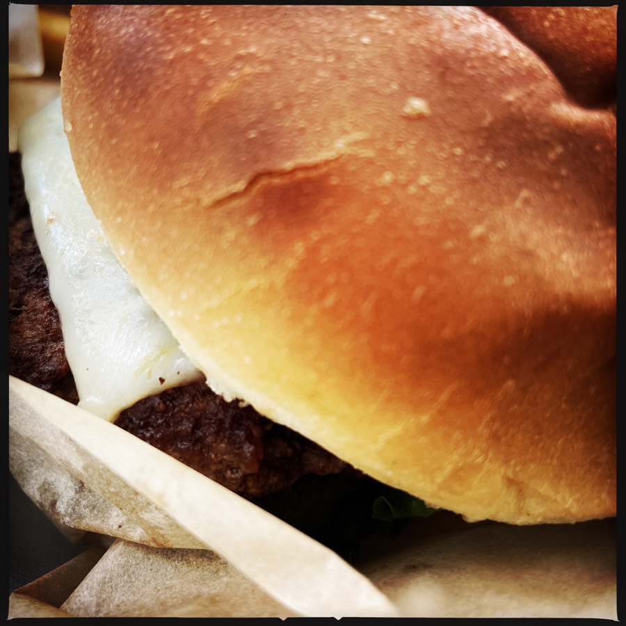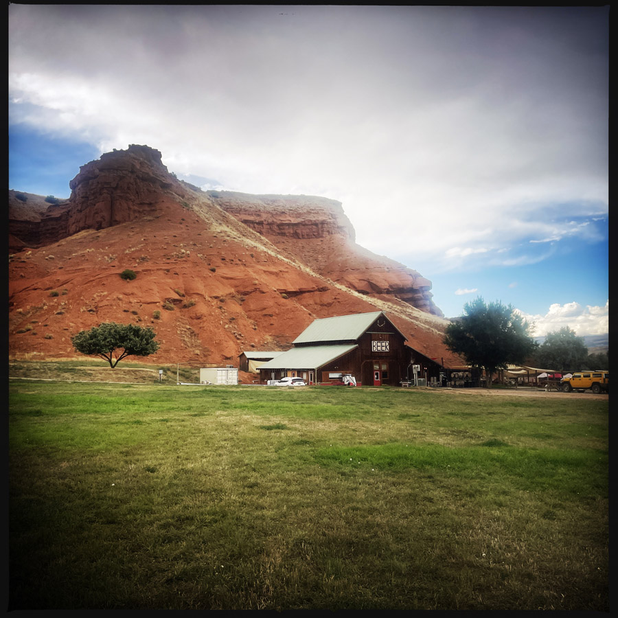 On dort devant une micro brasserie installée dans une ancienne grange et devant un gros caillou rouge. C’est très beau. On arrive pas tard, mais il ferme à 20h, alors on décale l’apéro. Manu va chercher à manger pendant que j’écris. Y’a un truc à burger pas loin. Ça fera le job. On a failli prendre des Moutain Oysters (oui, des huîtres de montagne). Ce sont en fait, des testicules de bœuf (taureaux ?). C’est bizarre d’associer des couilles à des huîtres, quand même. Il parait que c’est bon, mais à 20 dollars, ça faisait cher l’expérience. J’imagine que c’est pour mettre en avant la délicatesse du plat ? Nous sommes restés simples. Burger it shall be. Oh bah il pleut pendant qu’on mange. C’est presque une tradition maintenant.