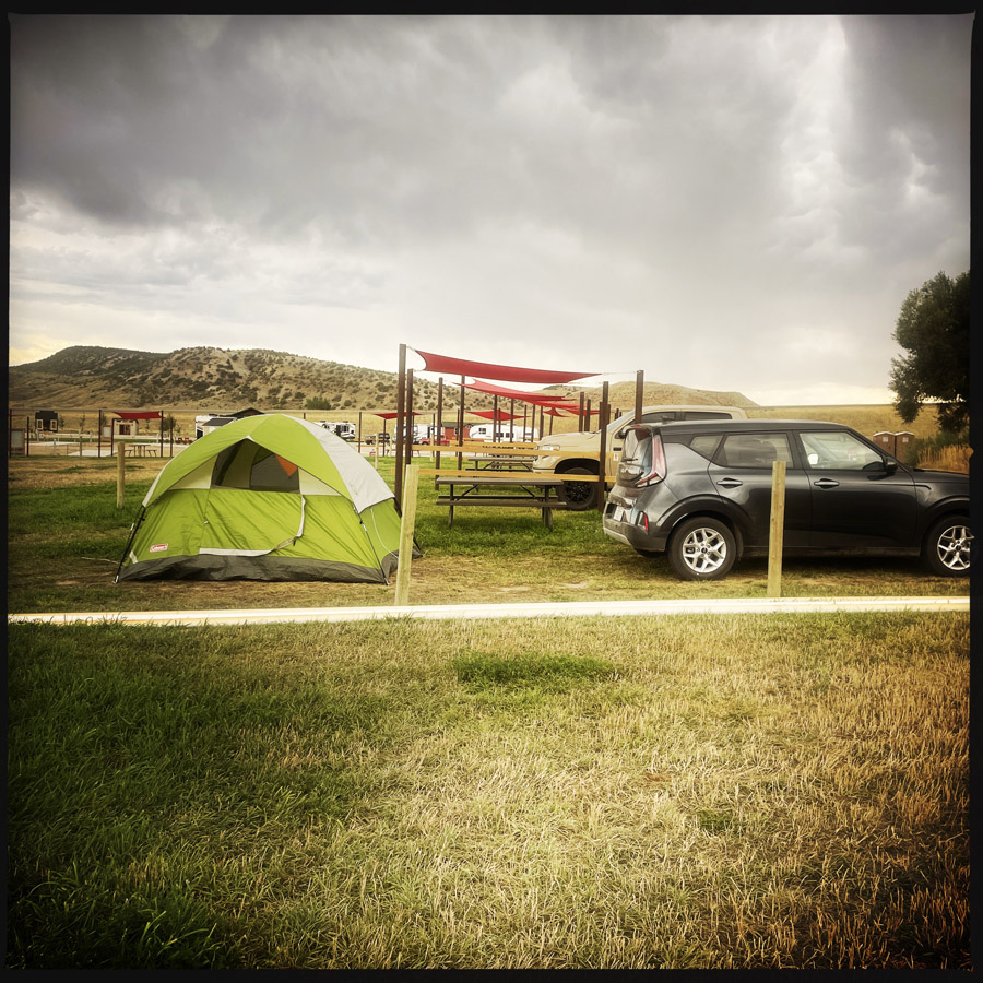 On reprend la route pour notre prochain dodo. On campe ce soir. Oh ne riez pas. On a monté la tente en 8 minutes. Quand y’a pas de tempête, c’est facile en fait. On peut lire les instructions, y’a rien qui bouge, rien qui s’envole, pas besoin de courir après quoique ce soit. C’est pu la peine de vous la raconter les campeurs.