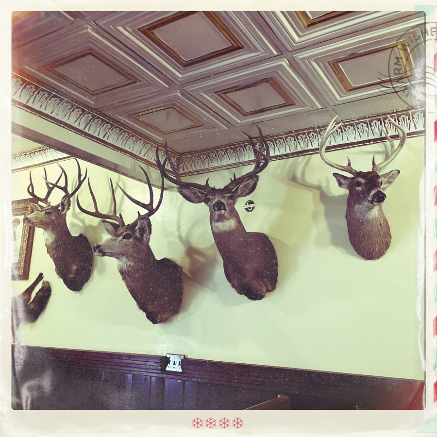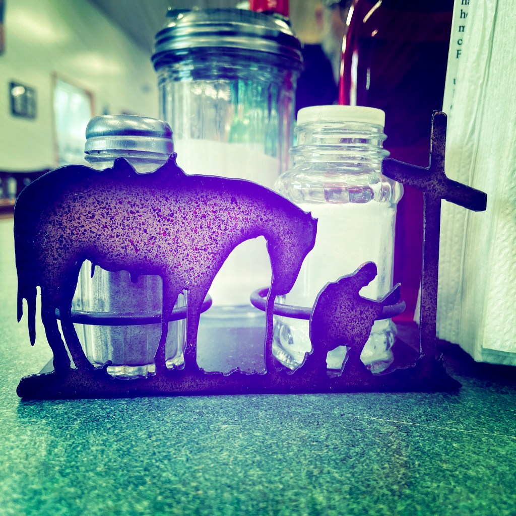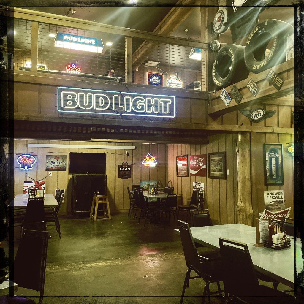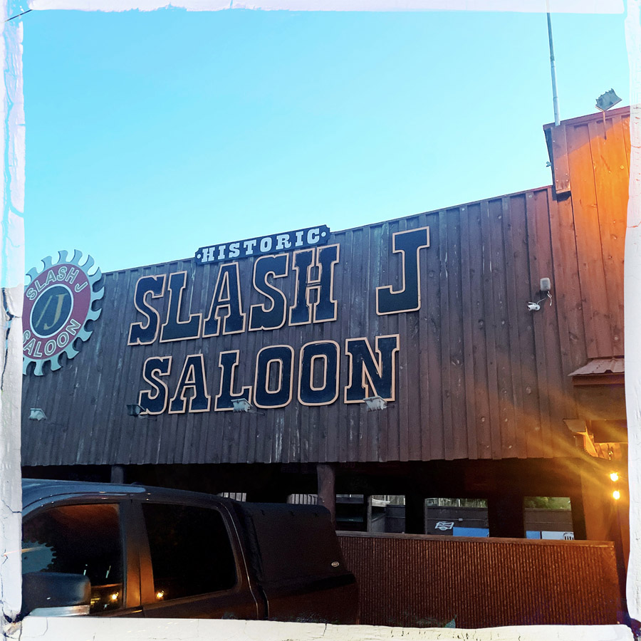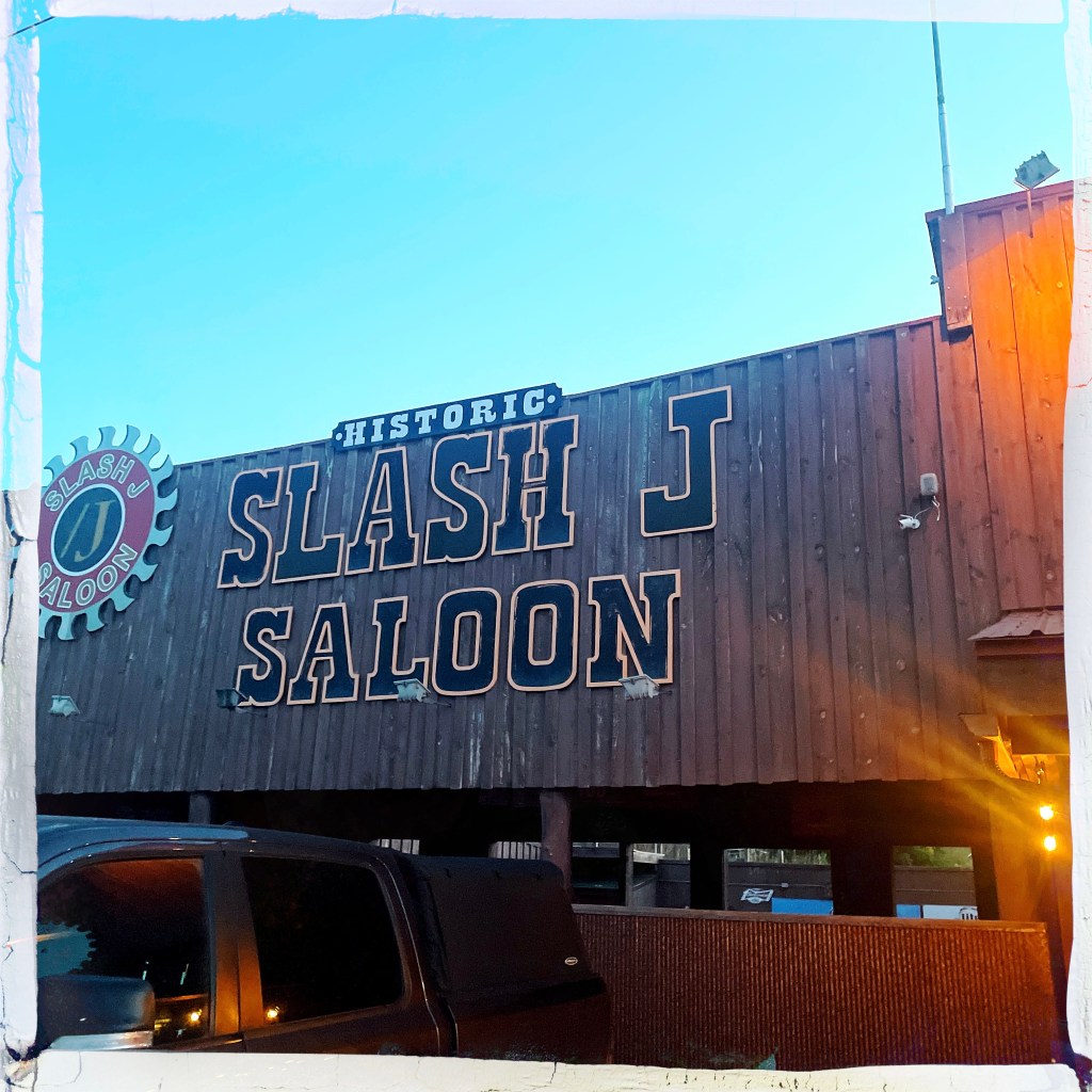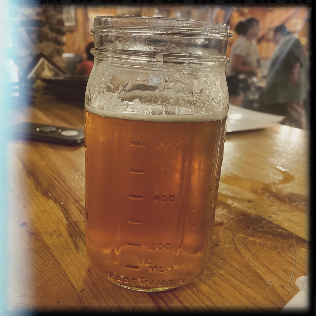 On va diner au Slash J Saloon. On entre. Oh ! C’est hyper local. Famille, vieilles personnes. Une dame nous accueille avec une voix gentille et nous installe au bar. On cause un peu, je prends une salade avec les steack tips marinés (spécialité de la maison) et Manu prend pareil mais sans salade et avec de la purée. Je prends un vrai thé glacé, Manu une bière, et pensant prendre une pinte, se retrouve un godet géant d’un peu moins d’un litre. Ils sont foufous ces américains.