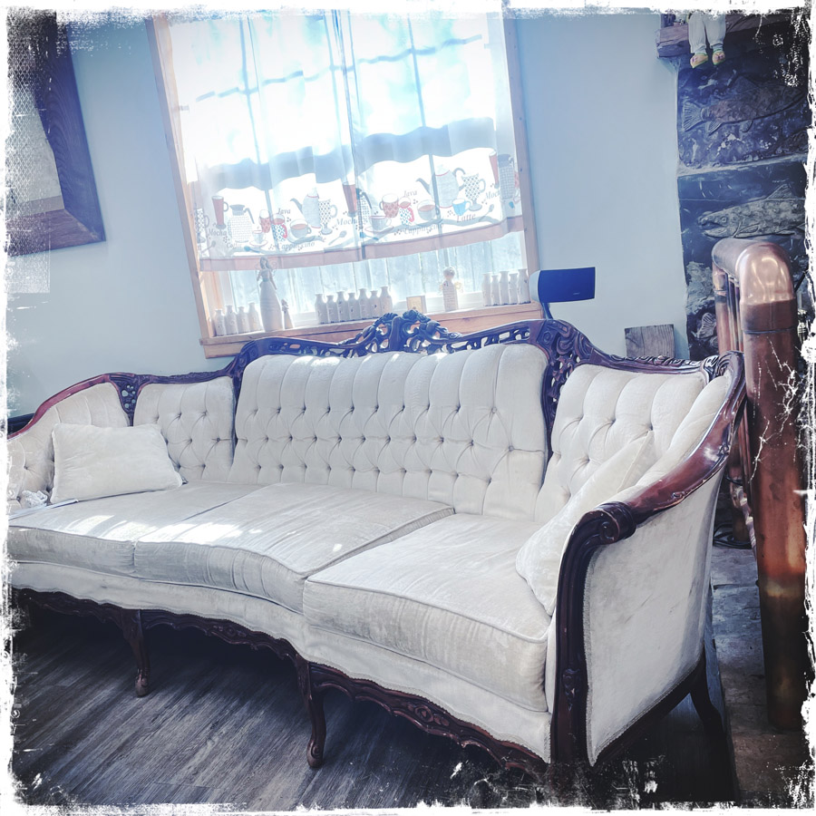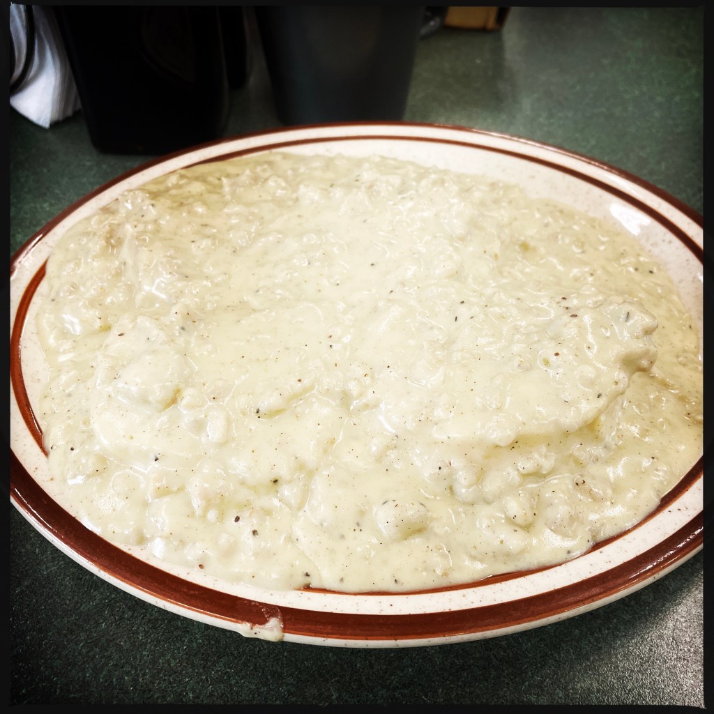 Je commande (oui bah oui), le HOMEMADE biscuits and gravy, la grosse portion, et Manu la petite avec du pain perdu. Sur un très joli canapé près de nous, un monsieur ébouriffé se balance d’avant en arrière, un café à la main.