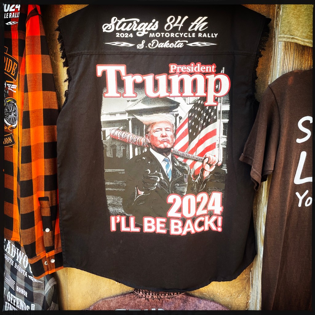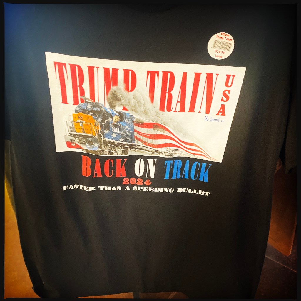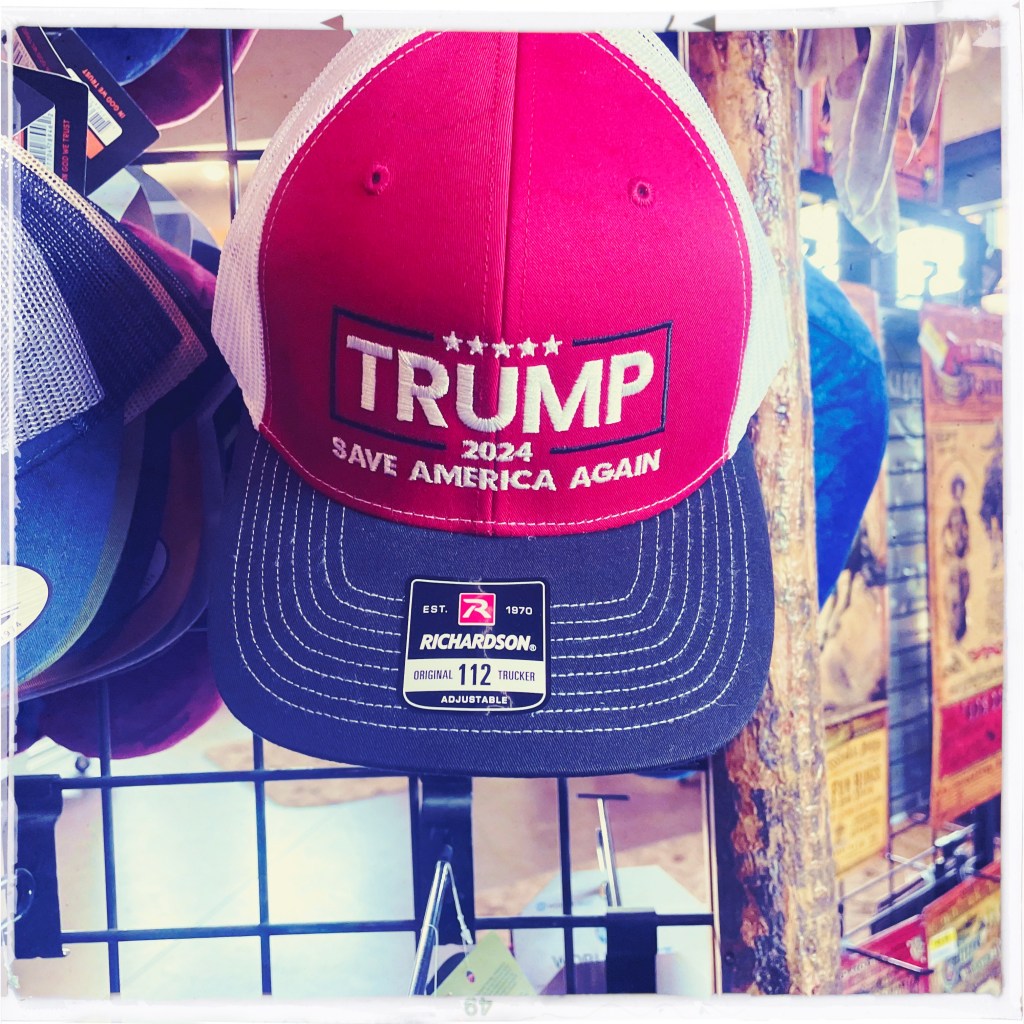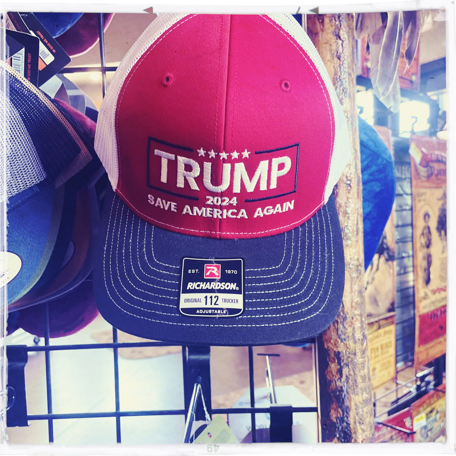 On fait un stop pour que Manu mange un bout (moi perso, le B&G va me faire la journée). Petit bled, grosse station essence. Allez, ça ira bien. Je me balade dans la boutique. Y’a des trucs pro Trump partout. Décidément. Pfff. Ça donne envie de rien acheter.