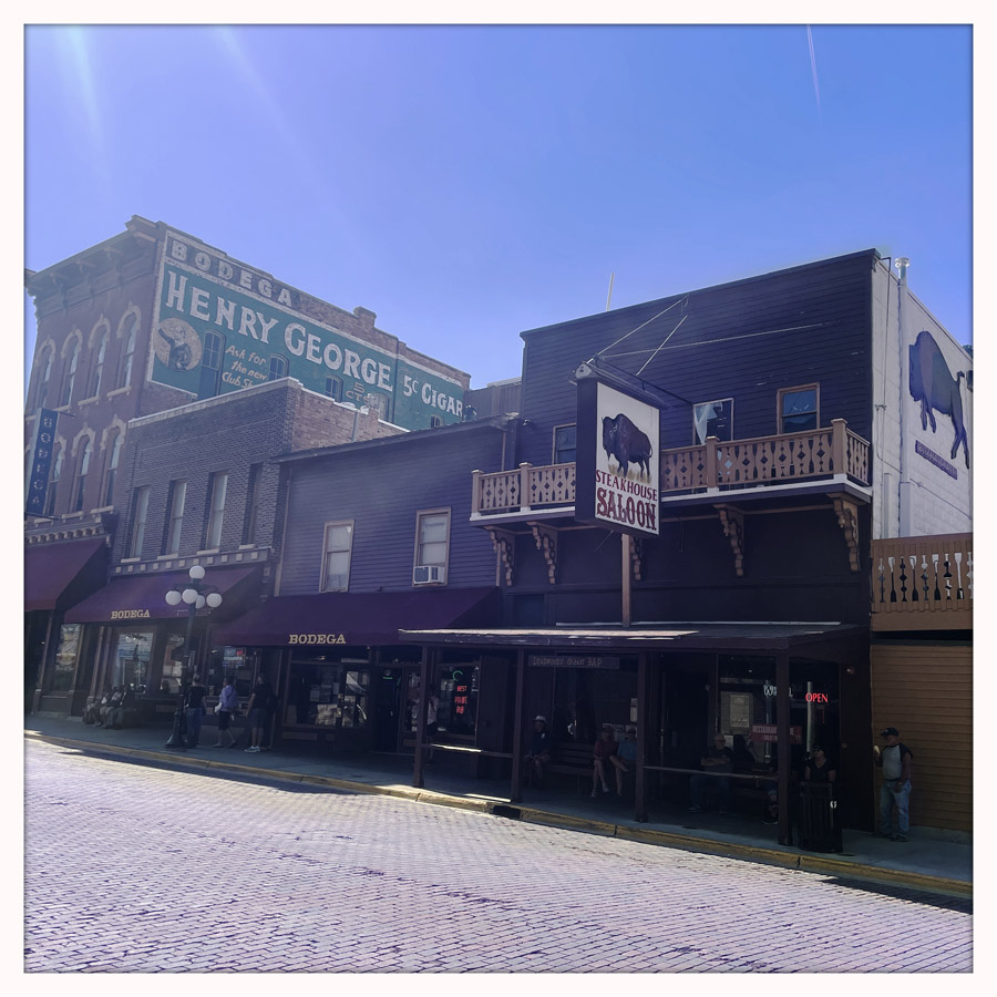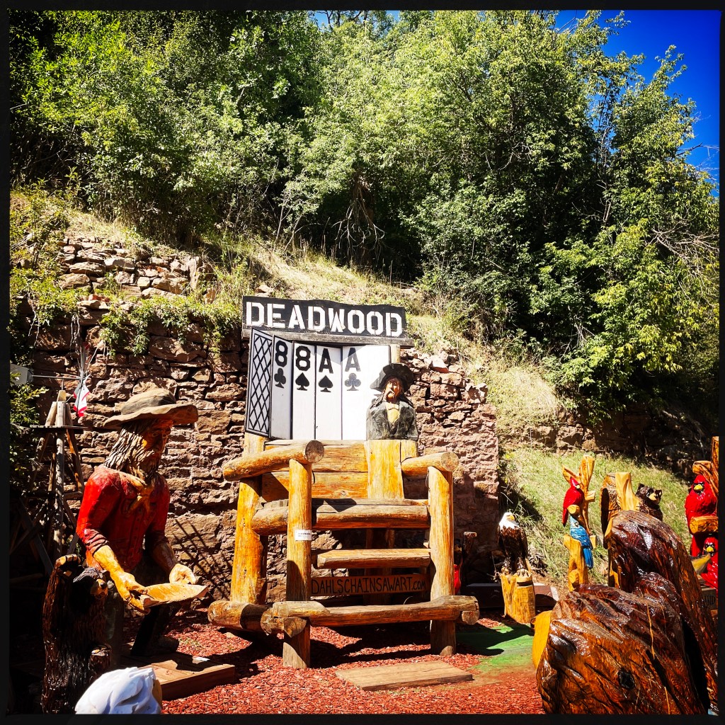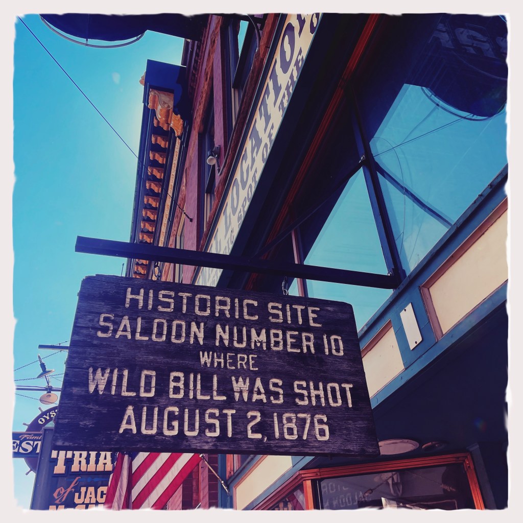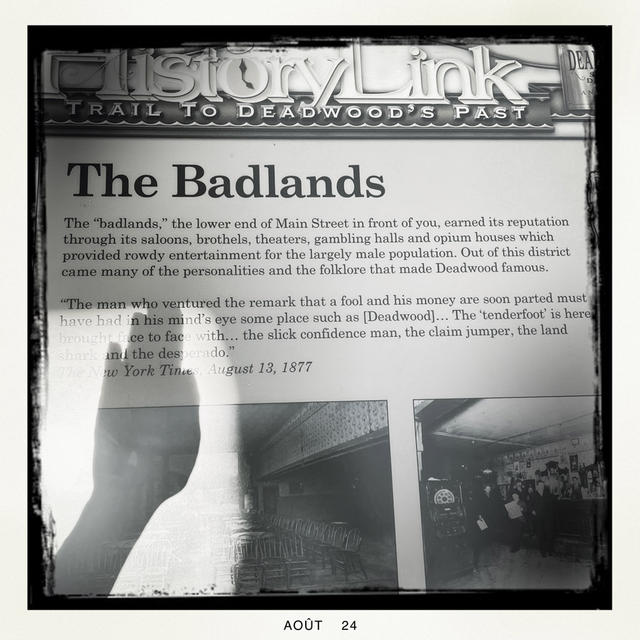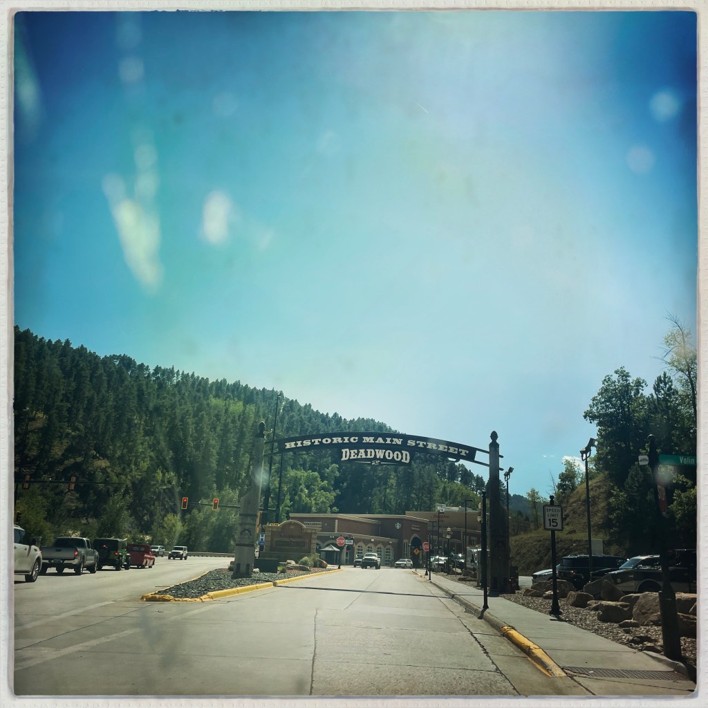 On arrive à Deadwood, qui est devenu un genre de ville western en plastique. Des magasins partout, très très très pro Trump (on n’a rien acheté). Mais il reste des bâtiments historiques magnifiques, avec des panneaux en bois qui disent que c’est ici que machin a été tué ou que c’est ici que bidule s’est fait arrêter.