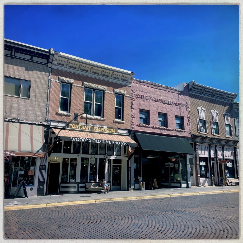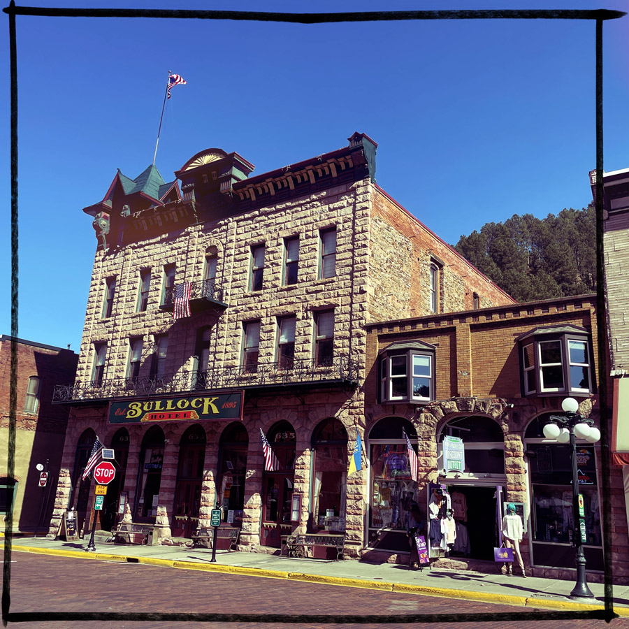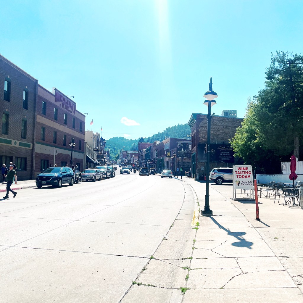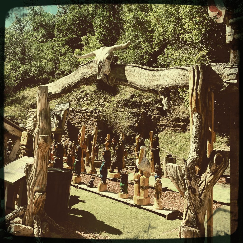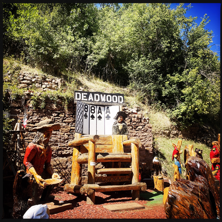 On arrive à Deadwood, qui est devenu un genre de ville western en plastique. Des magasins partout, très très très pro Trump (on n’a rien acheté). Mais il reste des bâtiments historiques magnifiques, avec des panneaux en bois qui disent que c’est ici que machin a été tué ou que c’est ici que bidule s’est fait arrêter.