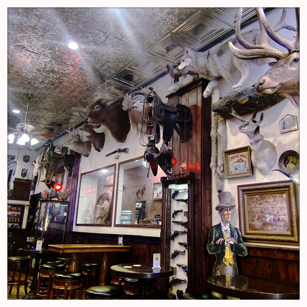 Ça a l’air mignon comme tout. Je me dis qu’ils sont rigolos, au dessus de la porte, il y a un panneau où est écrit « Sinners Welcome ». Ça doit être genre ambiance cowboy, avec des blagues.