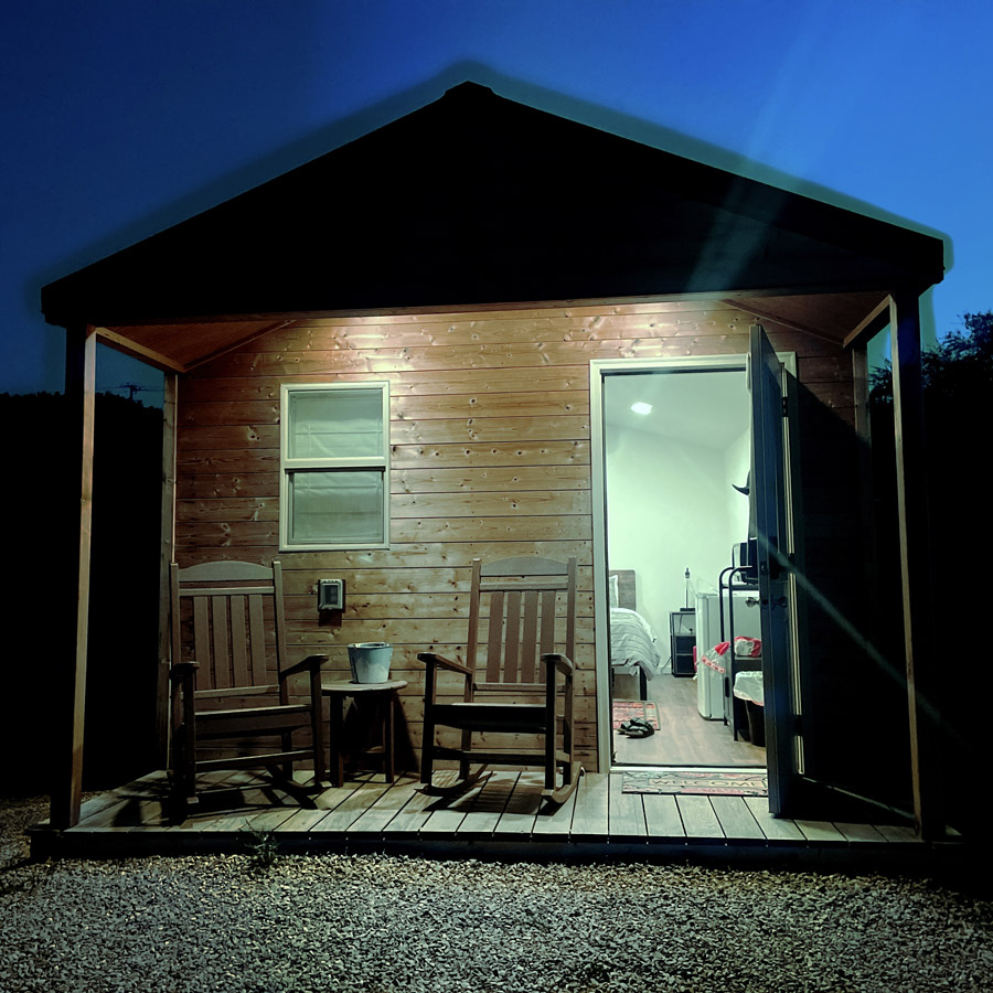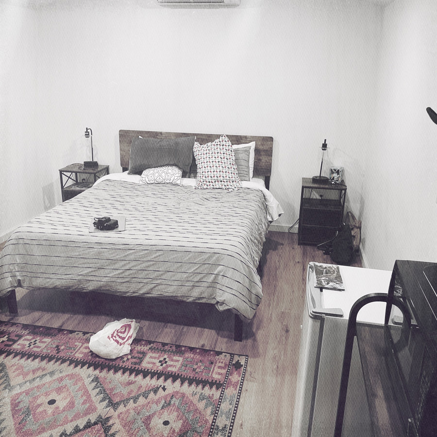 On est dans un genre de camp, avec des tas de cabanes identiques, c’est pas mal cool. Le lit est confortable, il y a un frigo et un micro-onde pour demain matin. Dans l’enveloppe avec les infos pratiques, il y a une boisson gratos au bar d’à côté.