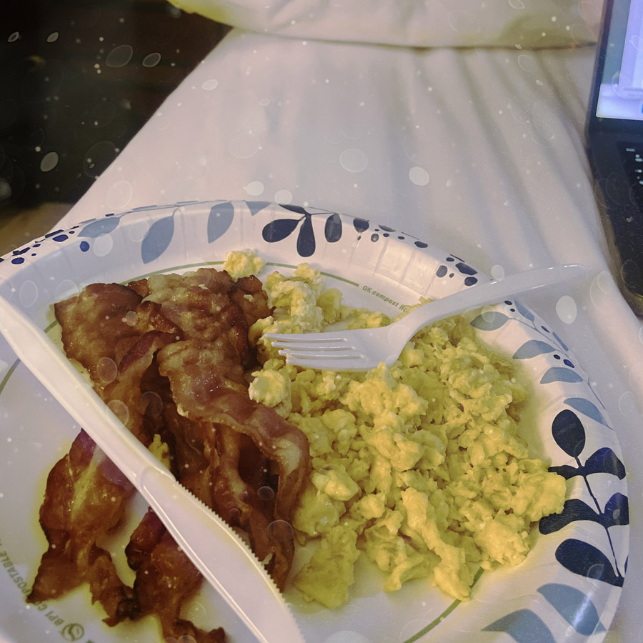On se lève, Manu va chercher un petit déj pas cher à l’accueil. C’est pratique, y’a une cuisine, et pour 5 balles, on a des œufs et du bacon. Le programme du matin, c’est de retourner dans les Badlands pour faire de la balade, puis, la route et la moche nous emmèneront vers la suite.
