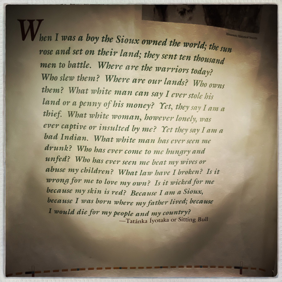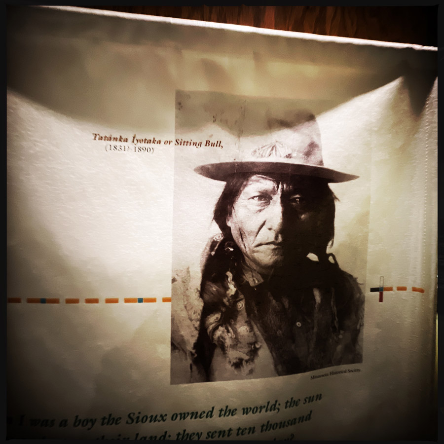 C’est très beau, il y a plein d’objets, de textes, de jouets, de costumes. C’est minimaliste et très fort. Je m’arrête devant le portrait de Sitting Bull (Tȟatȟáŋka Íyotake) et en dessous un texte. Je crois que j’étais déjà émue en démarrant la visite, cette lecture me broie.