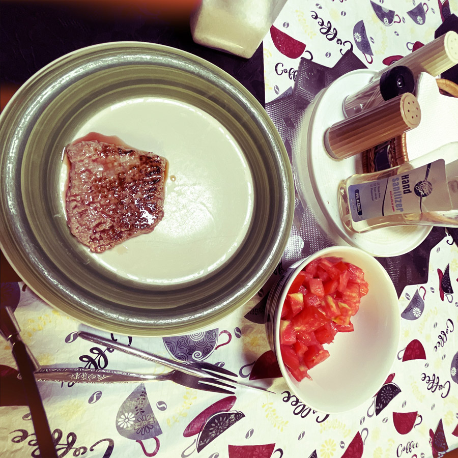 On achète du cube steak sans trop savoir ce que c’est. En fait, on pensait, de visu, que c’était du steak haché. Que nenni. C’est du bœuf qu’on a battu avec un marteau à dents. Et en fait, ça cuit très longtemps (6h). Nous on l’a fait à la poêle, 2 minutes. Bon, ça va hein, mais c’est pas foufou. Ma tomate est super.