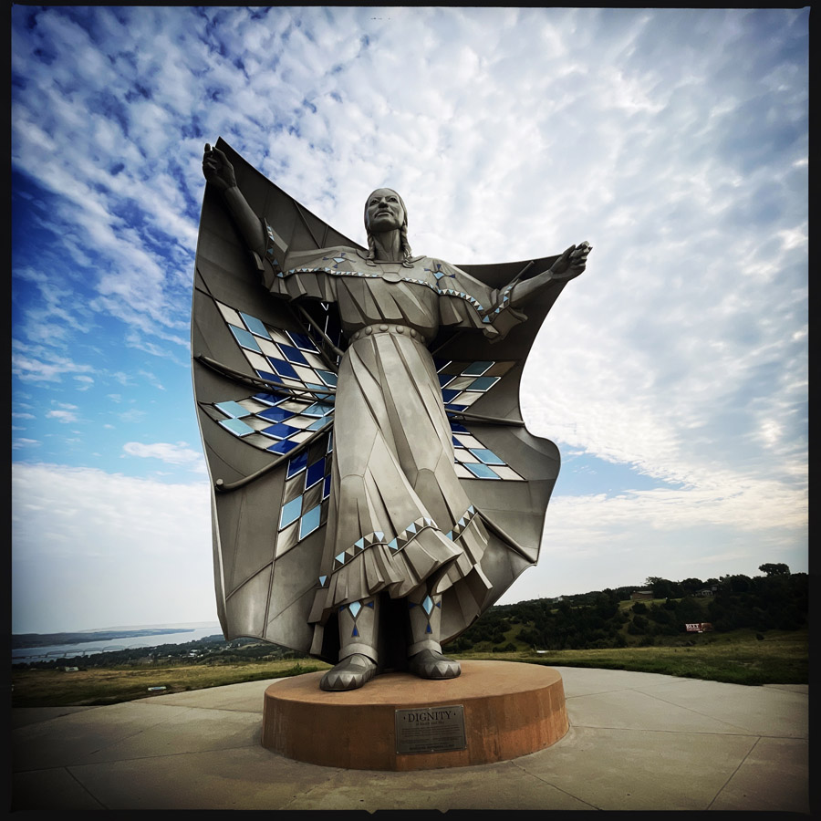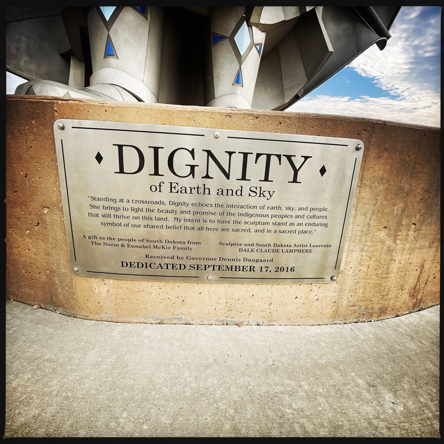 On fait un petit détour pour aller voir, Dignity of Earth & Sky. C’est une œuvre du sculpteur américain Dale Claude Lamphere. Je vous mets la photo avec le petit texte.