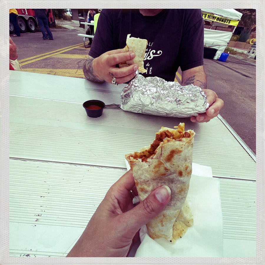 Devant le palais du Maïs, c’est la fête. Y’a des stands de bouffe à plus savoir quoi choisir, et il est midi douze. D’ailleurs on a du mal à choisir. On opte pour un burrito à partager, recette El Pastor (porc et ananas), c’est diablement bon. Et pour une fois, niveau quantité, c’était trop juste, alors on prend un autre sandwich à partager sur un autre stand, au pulled pork, coleslaw, et je dois bien dire que ces gens savaient faire cuire du cochon.