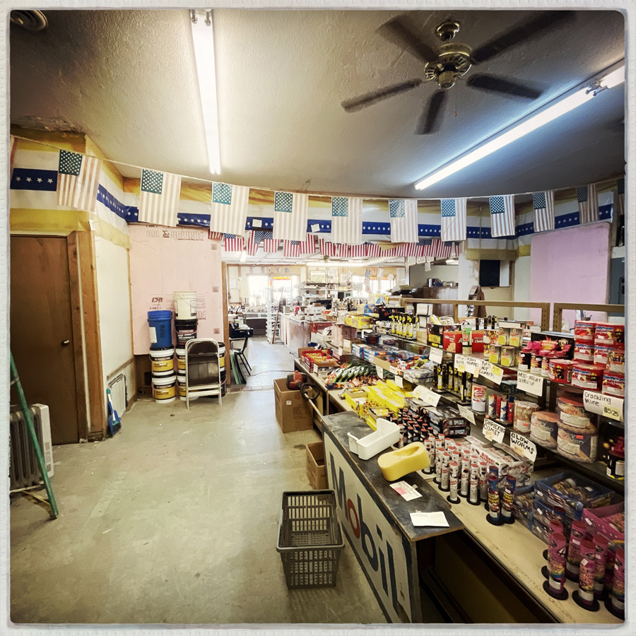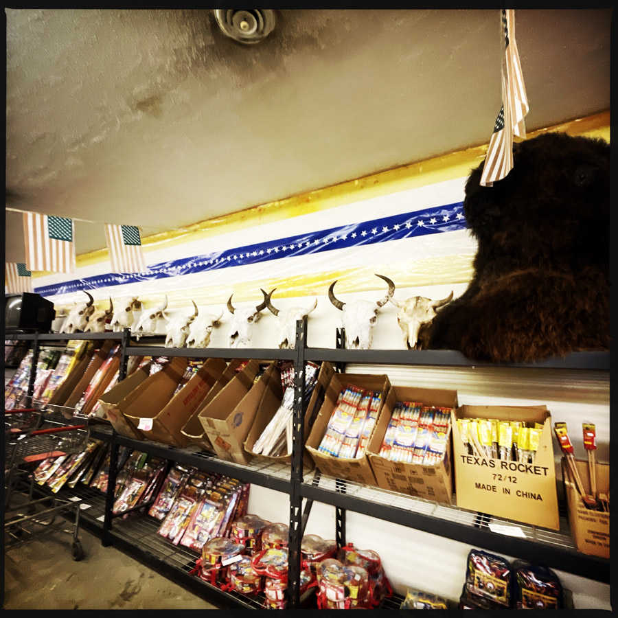 Un petit station service à l’abandon, il y a malgré tout un panneau « OPEN » sur la porte. Je rentre pendant que Manu fume une clope. Le monsieur est fort bourru. Il dit des mots polis mais en grognant. Je fais un petit tour pour me donner un contenance, c’est le bordel là-dedans. Y’a des cranes de bisons partout, des feux d’artifices, et des tas de machins en vac et des frigos qui n’ont pas l’air de marcher. Je demande le prix pour visiter la ville. C’est 10 balles. Et là, pour botter en touche, je dis LA PHRASE de la honte « I’m gonna ask my husband. » Bravo Sibylline pour la révolution féministe…