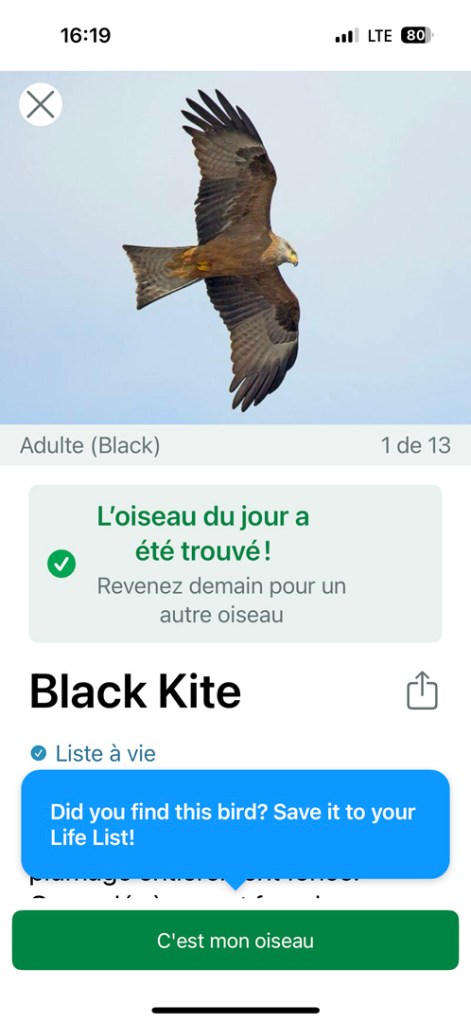 Sur des aires d’autoroute, on entend des bruits d’oiseaux (ok, c’était pas une grenouille). Depuis peu, j’ai installé une appli super, qui te permet, grâce à ton micro de téléphone, de savoir quelle bestiole c’est. On les voit, posés en haut des réverbères. Ce sont des Milans noirs.