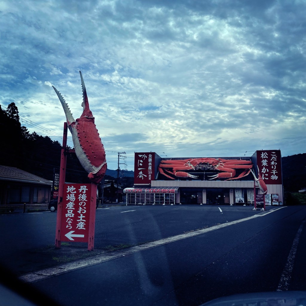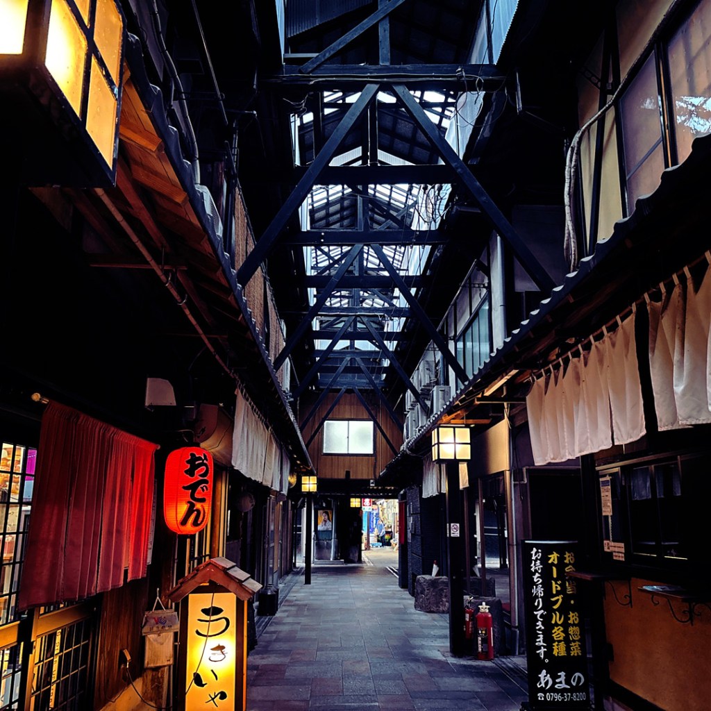 On arrive dans la ville de Toyooka. J’ai trouvé une auberge de jeunesse qui avait l’air mignon. On arrive, mais je n’ai pas eu d’indication pour le parking. Je rentre à pied dans un genre ruelle qui abrite un marché couvert. L’auberge de jeunesse est là. Je fais coulisser la porte, je cherche quelqu’un. Une dame adorable arrive, un sourire merveilleusement accueillant sur son visage, et on se dépatouille comme on peut pour que je lui dise qu’on ne sait pas où est le parking, alors hop, elle sort avec moi dans la rue, je lui montre où est Manu, et on trottine toutes les deux devant la voiture deux rues plus loin pour guider Manu à la place réservée. Elle nous laisse le temps qu’on prenne nos affaires.
