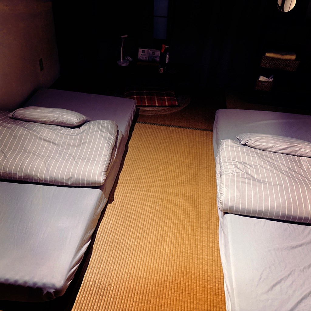 Notre chambre est à l’étage, chou comme tout. Les deux futons sont séparés. Je crois qu’il y a une volonté de préservation du sommeil de l’autre. Le sommeil est un moment individuel.