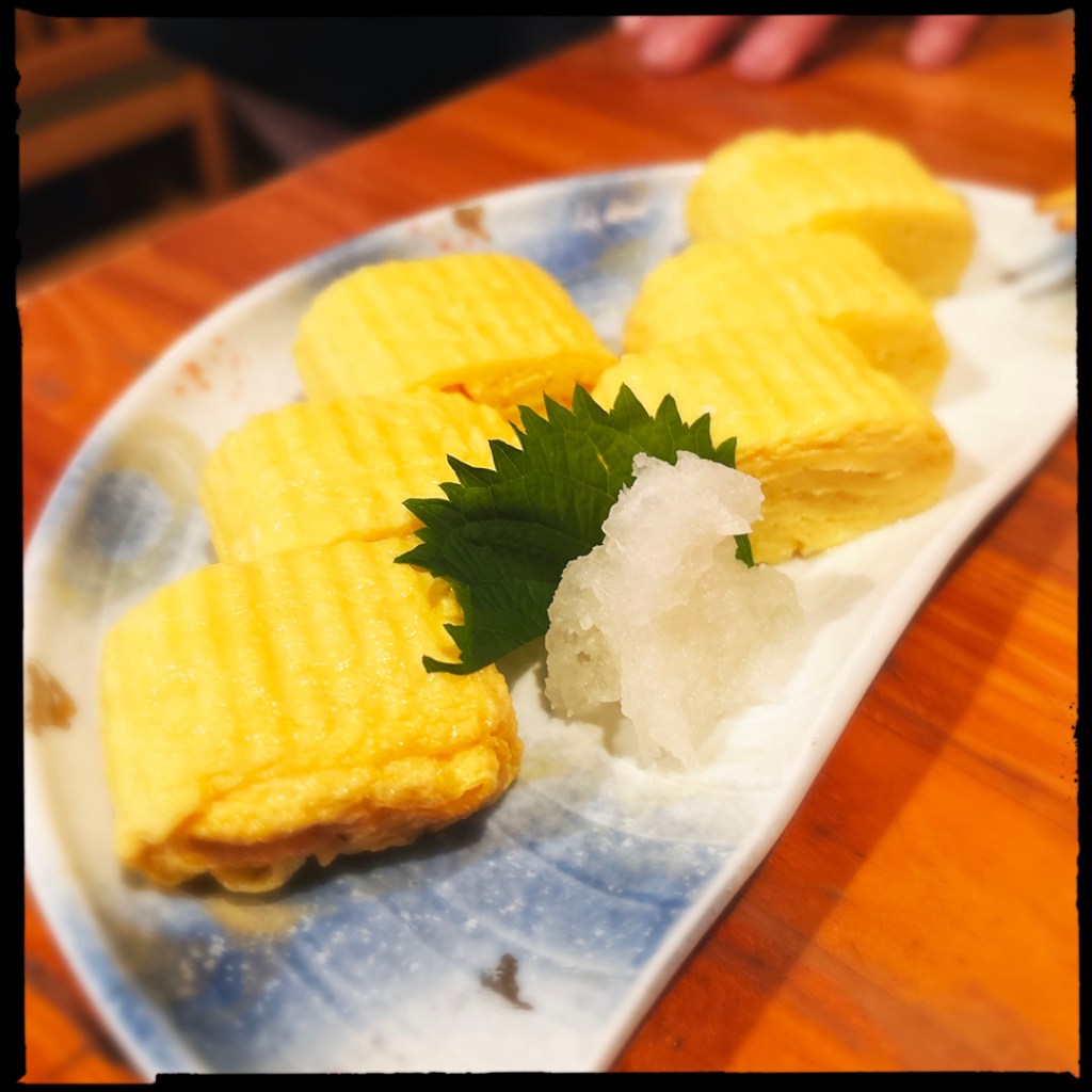 Devant l’omelette, on s’interroge pour ne pas faire d’impair. Alors on interroge. Est-ce qu’il faut faire quelque chose ? Le cuisinier sort de derrière son comptoir, et nous fait voir. Il verse la sauce soja sur un petite montagne de (radis ?) rapé. Il prend un bout d’omelette, le met dans mon assiette, et le coupe en deux. Il met une petite portion de mélange (radis ?) soja sur l’omelette, et là c’est ok.