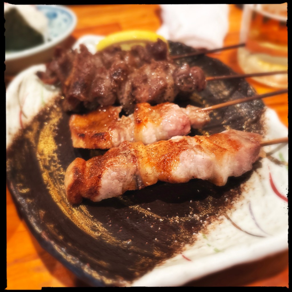 Oh des sashimis ! (les meilleurs). Des brochettes de porc et de tendons de bœuf, une omelette au dashi, et un onigiri à la prune. C’est fabuleux.