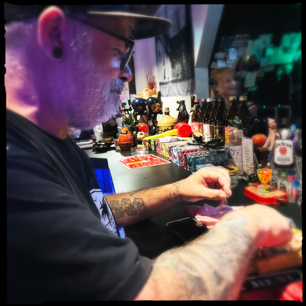 Y’a des jeux sur le comptoir, genre une mini pêche à la ligne à l’aimant, le truc où tu enfonces les dents du crocodile une par une et d’un coup ça se referme… D’ailleurs, elle nous fait jouer. Un coup le monieur, un coup Manu, un coup moi. Manu perd (gagne ?). Elle tape dans les mains, hyper enthousiaste. Ce que nous sommes en train de vivre est flou. Puis elle caresse mon bras, pour regarder mes tatouages, et me montrer le sien (un dragon). Elle les étudie un par un, en faisant glisser sa main de l’un à l’autre. C’est très déconcertant. On peine parfois à extirper un bonjour aux gens qu’on croise. Manu fume dans un silence de mort partout où il va. Il tente de lancer des conversations simple (en japonais), comme par exemple : « Il fait chaud. » Une fois la stupéfaction passée, les gens répondent « Il fait chaud. »