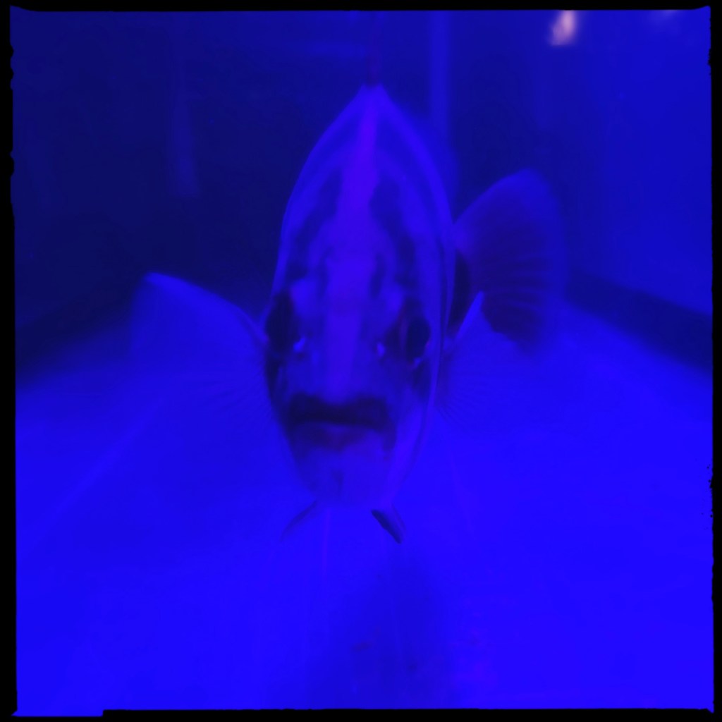 On grimpe un escalier, et on entre dans un bar (ça commence comme une blague des années 80). Y’a de la musique pas bien, des tas d’aquariums, donc un avec trois piranhas sans dents. Une dame avec une coiffure d’étudiante, des collants résilles, des manières de jeune fille mais qui a plutôt mon âge ou plus nous accueille avec BEAUCOUP d’enthousiasme. Elle nous amène une petite assiette avec une rondelle de jambon cru, et un genre de salade de mayonnaise pour accompagner nos bières. Au bout du bar, un monsieur qui semble être un habitué boit un coup, et un couple arrive 10 minutes après nous prend des gin tonic.