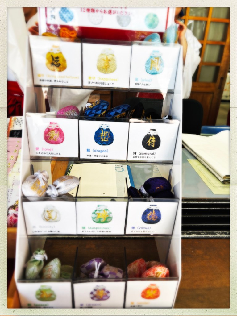 Un petit tour shopping au port, et on passe au temple. Il y a un stand avec des omamuris. C’est ça qu’on est venu chercher. Manu ne croit qu’à la magie de la Nouvelle Orléans. Mais bon. Moi je crois que c’est joli. Ce sont des petites amulettes, en tissus ou autre. Si je peux ramener de l’amour, de la chance ou autre, aux gens que j’aime, allez.