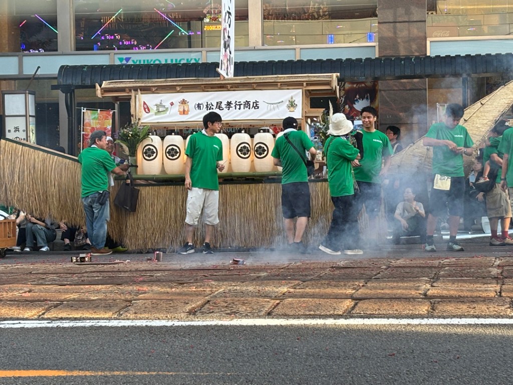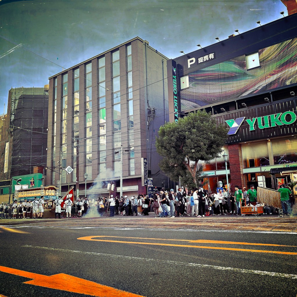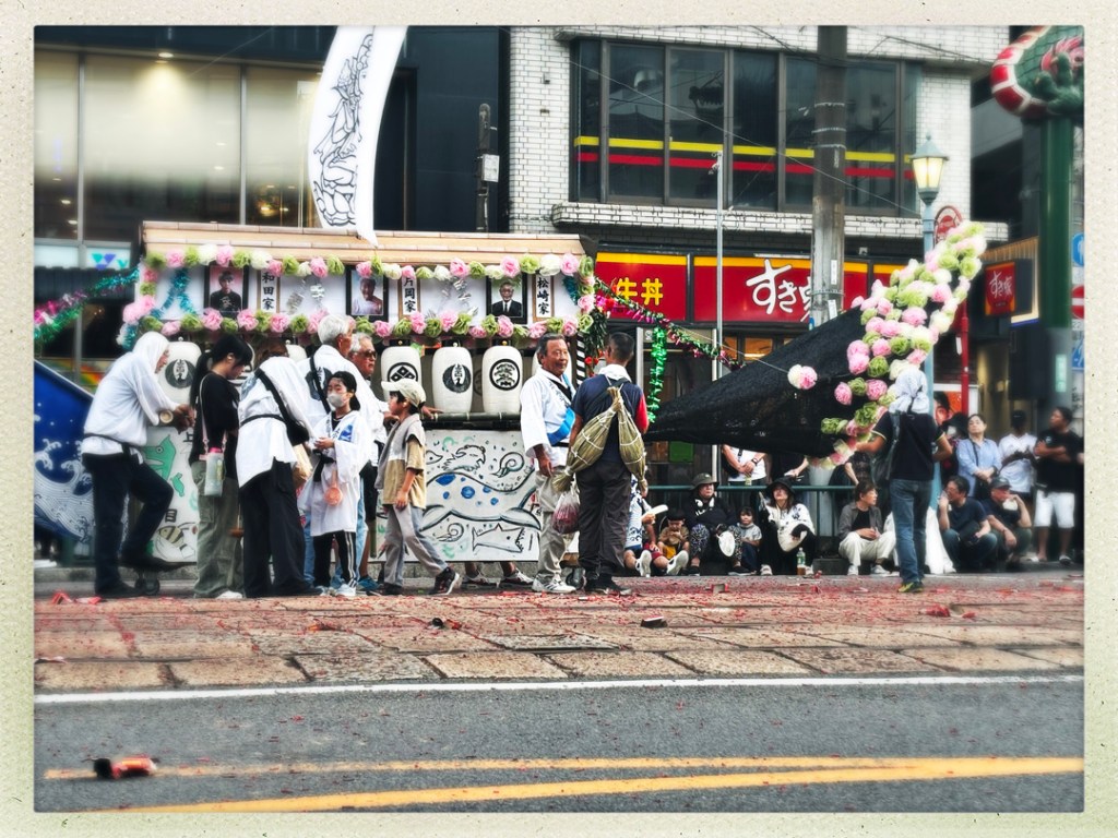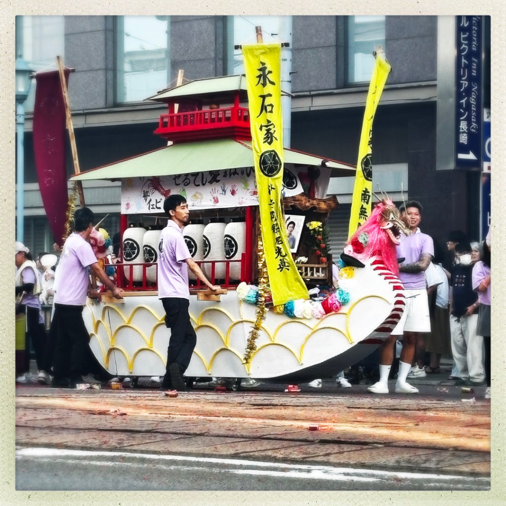 Bon allez, zou. On rentre poser la bagnole. Car cet après-midi démarre Obon dans les rues du centre de Nagasaki. Hier au soir, en discutant avec Tohishihito, il nous a un peu expliqué. Ils célèbrent les morts de l’année passés. Ils construisent des bateaux, décorés, et paradent dans les rues en jetant des pétards. Il dit que c’est très bruyant. On est intrigués, on a du mal à imaginer. Il est encore tôt (13h45), on tente de manger pas loin, ça ferme, caramba. On se rabat sur de la supermarché bouffe.