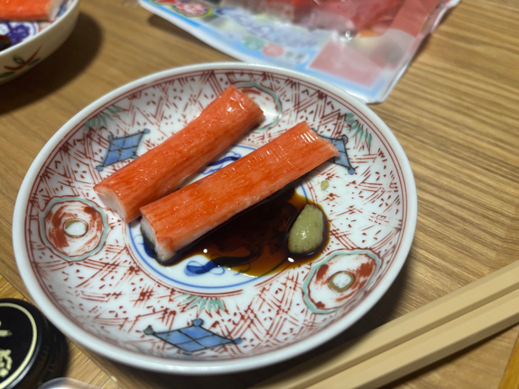 On boit, Mayumi va chercher du calamar séché, et du surimi. Elle est hyper réjouie de nous expliquer le principe du surimi. De fait, c’est du bon surimi.