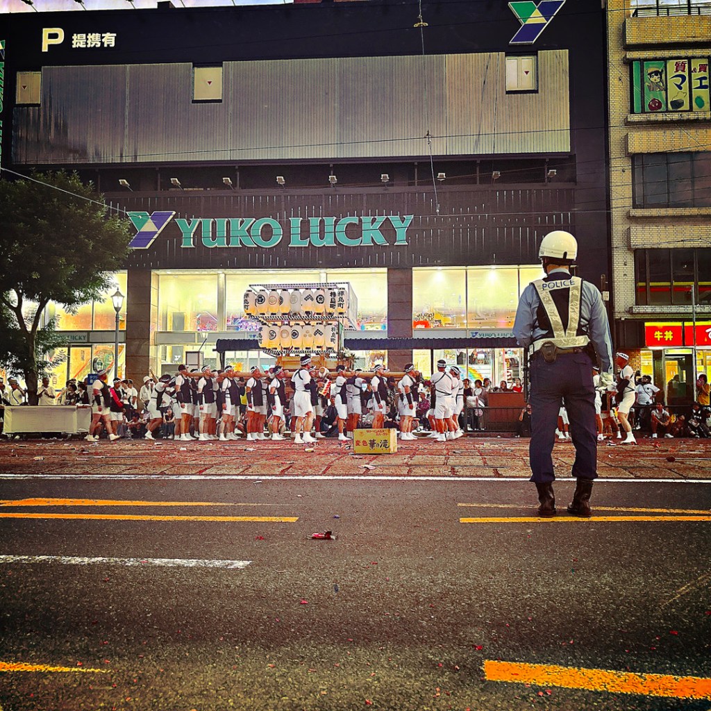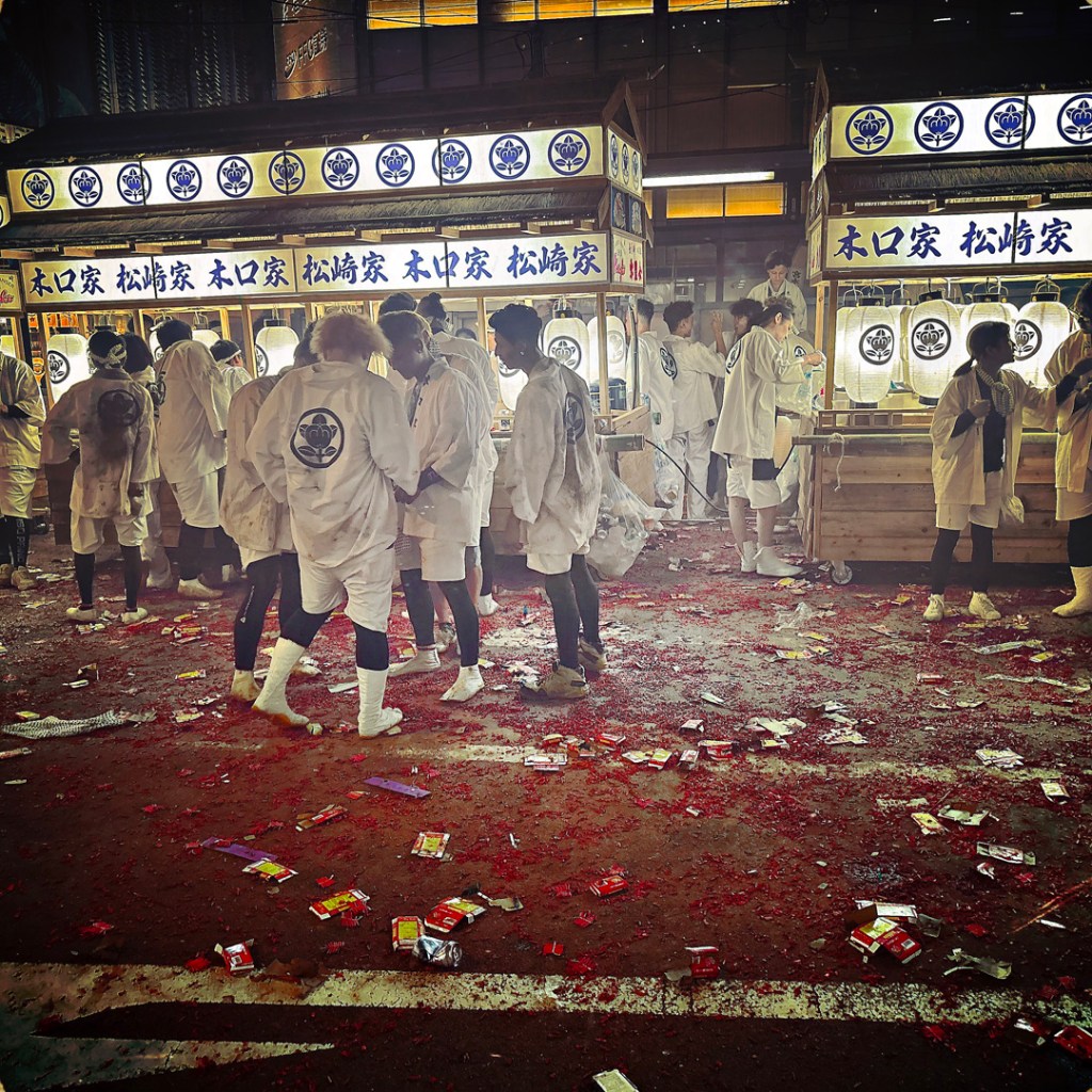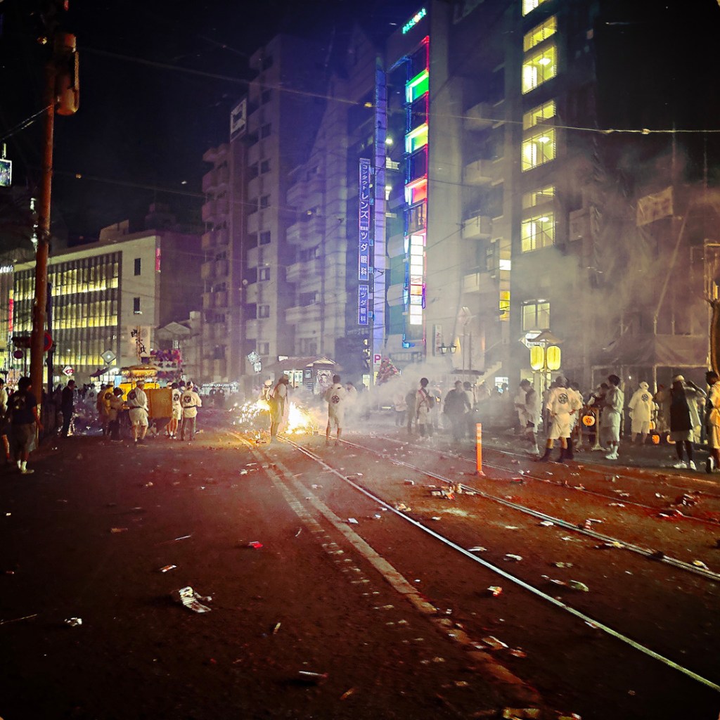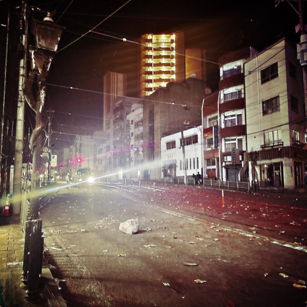 Le sol est recouvert de ces petites boites de chaînes de pétard. Il y en a partout. La fête va durer tard, rien ne faiblit, et pourtant en s’éloignant du centre, on tombe sur les équipes de nettoyage qui œuvrent déjà. C’est super impressionnant. On a été surpris et déconcertés de voir tout ce petit monde en avoir soudainement rien à foutre des politesses diverses et des règles. On pleure nos morts. YOLO. (YODO ?)