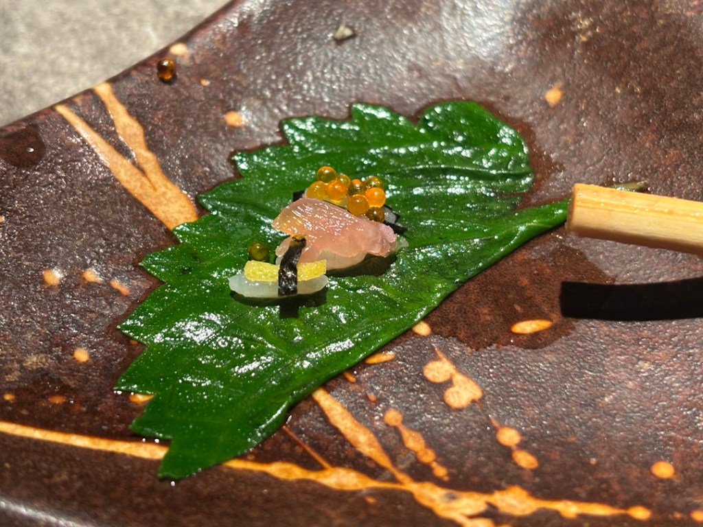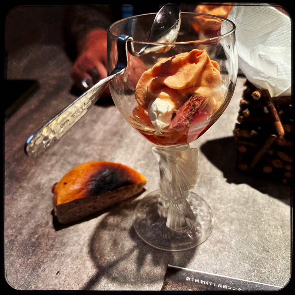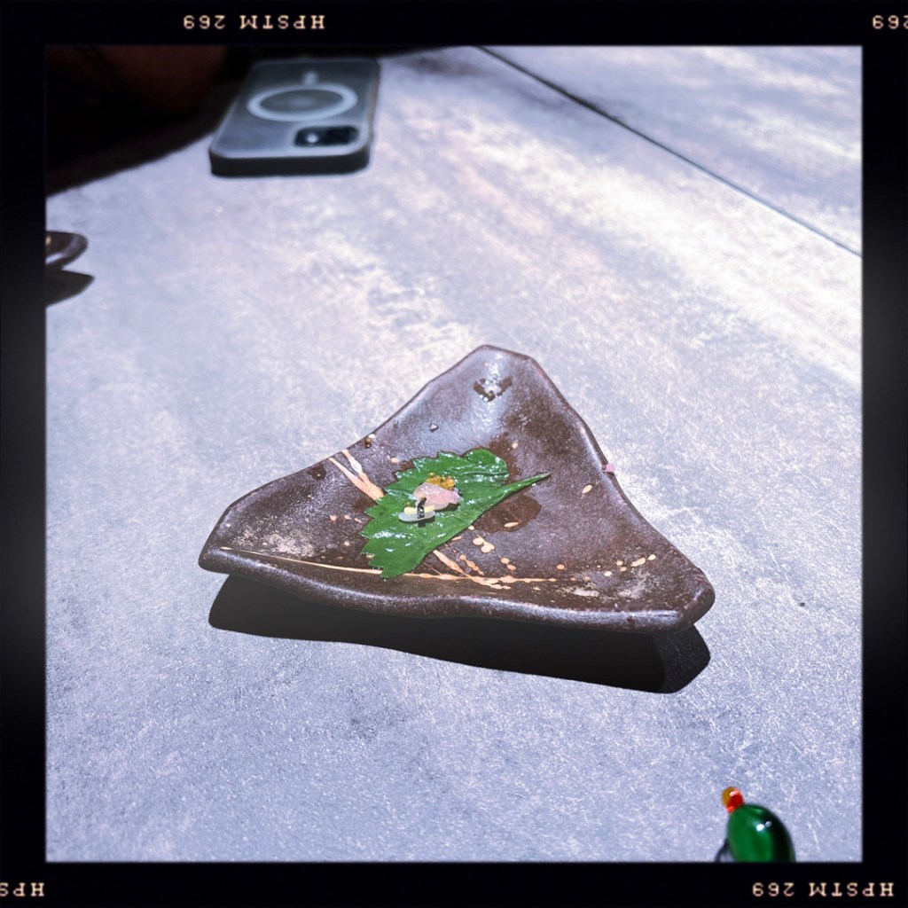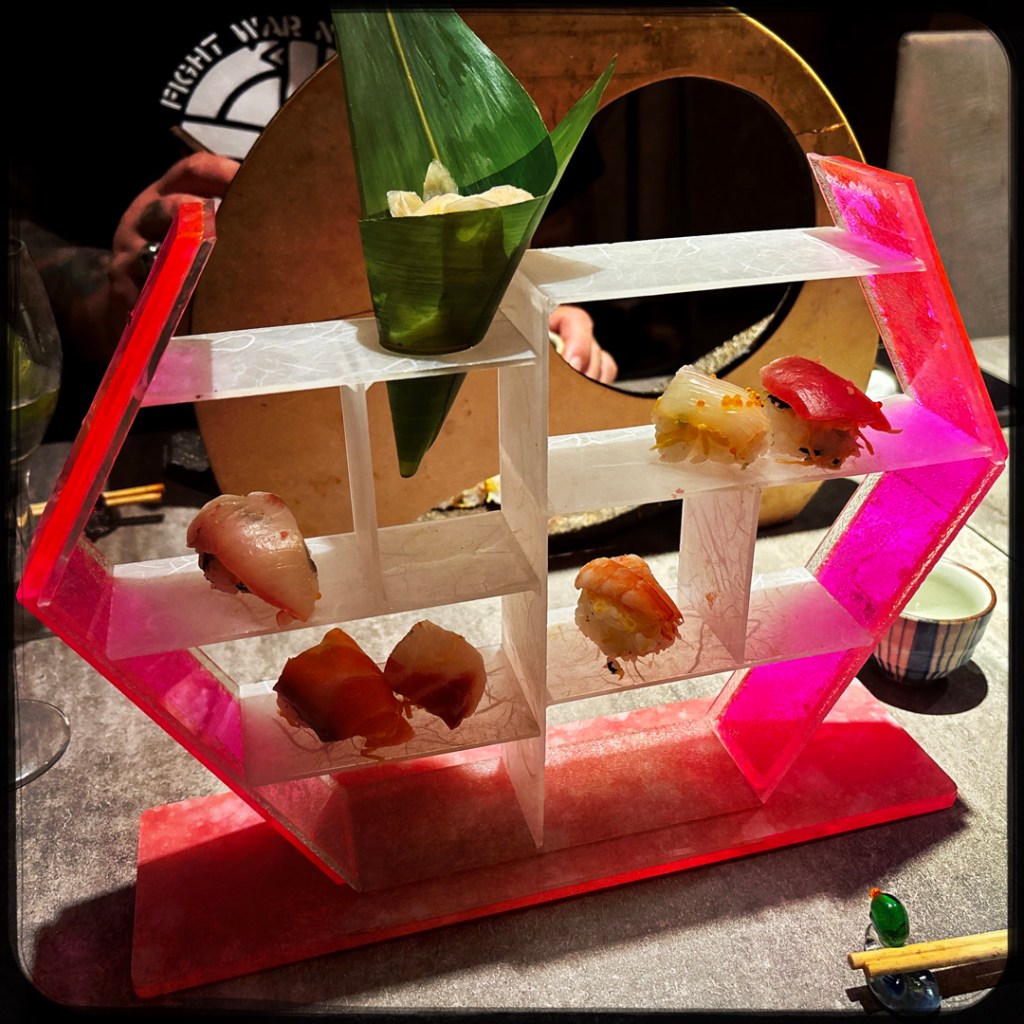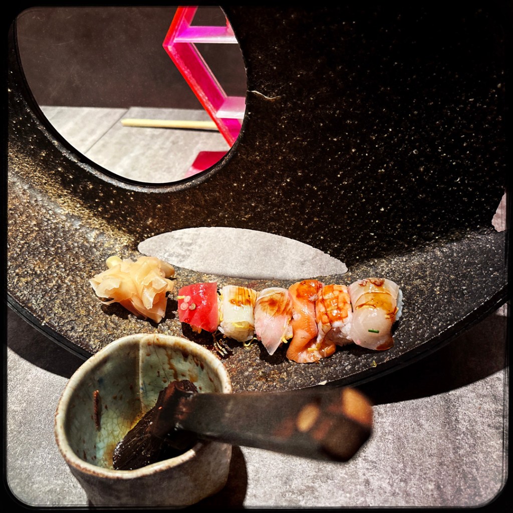 Il revient avec deux sushis de plus, et nous redit que ça c’est un cadeau. C’est du thon gras. (!!!) Il le passe très brièvement au chalumeau, et nous confie nos petites assiettes. J’en ai même oublié de faire une photo tellement c’était beau.