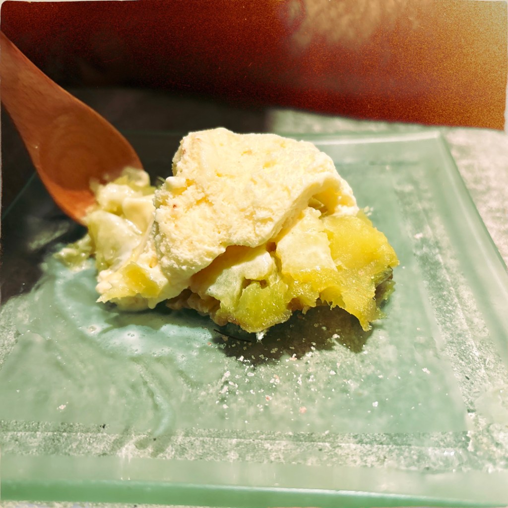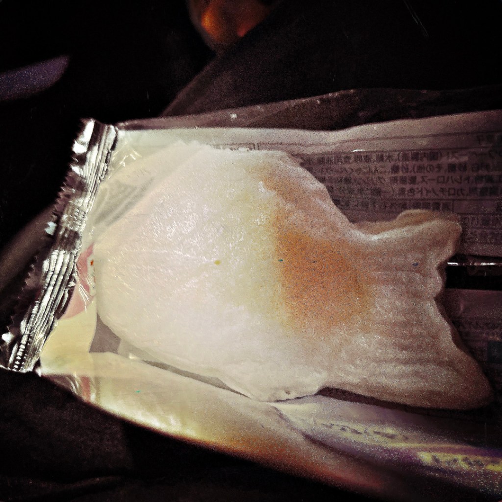 Il repart au pas de course pendant qu’on mange nos glaces, et revient avec UN AUTRE dessert pour Manu : de la patate douce avec de la glace à la vanille dessus et il met du sel. Huhuhu, tout est si surréaliste. J’aide Manu a finir parce que de fait, c’est beaucoup. Il amène la note. C’est bien les 8000 yens annoncés. Incroyable.