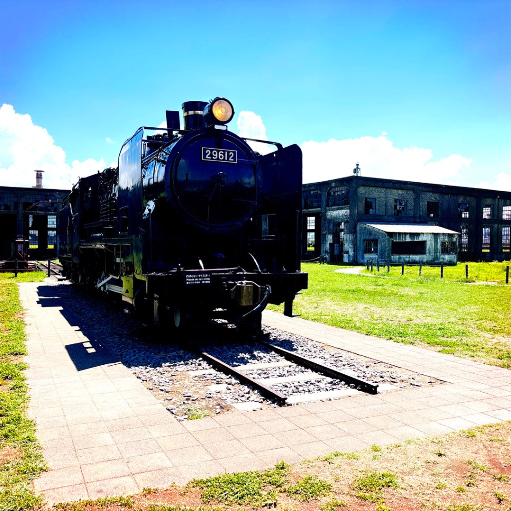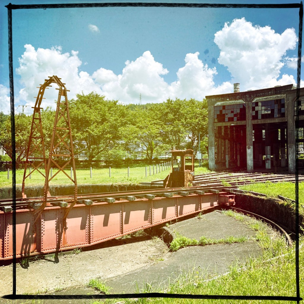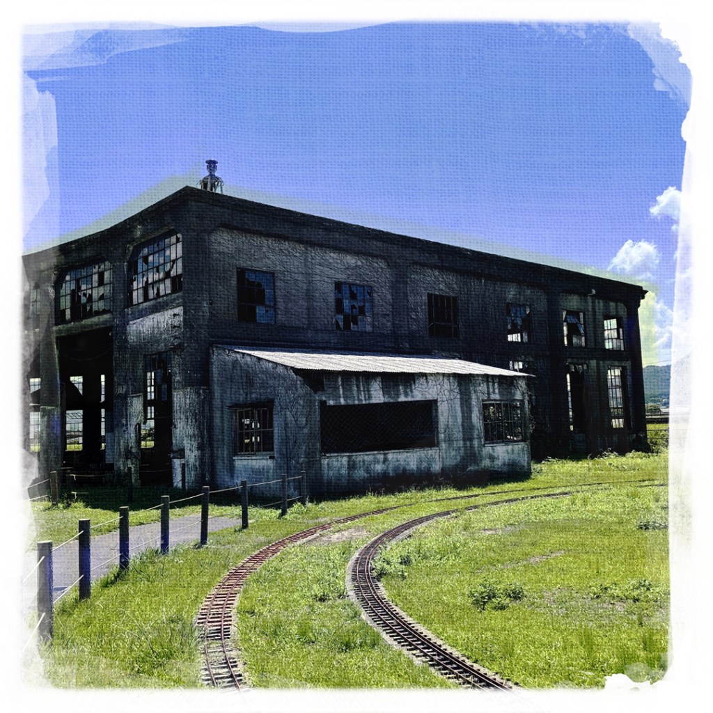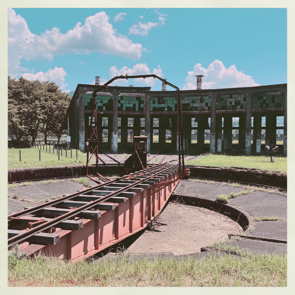 J’avais noté un truc à voir qui est sur la route, alors je mets ça dans le GPS. C’est le Bungomori Kikanko Park. Rien de fou, c’est un ancien dépôt ferroviaire, avec une plateforme tournante, qui permettait d’envoyer les locomotives à vapeur à droite, à gauche et ailleurs. Y’a une belle locomotive et la structure qui tourne, et le dépôt tout abandonné, où on ne peut pas aller. Caramba.