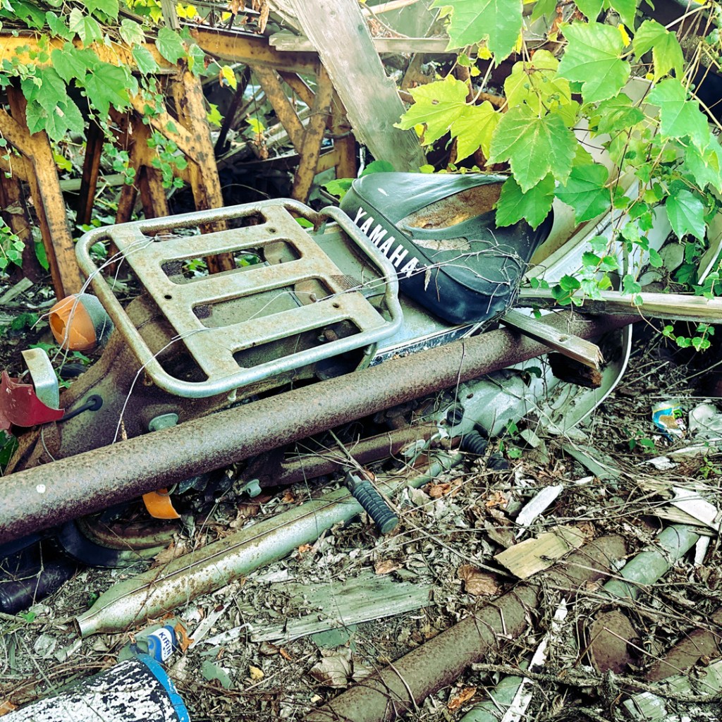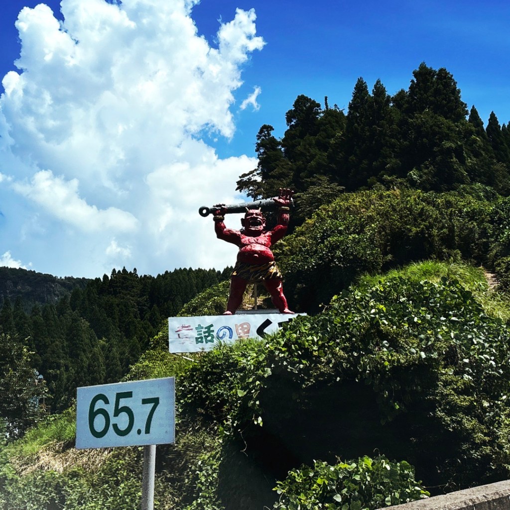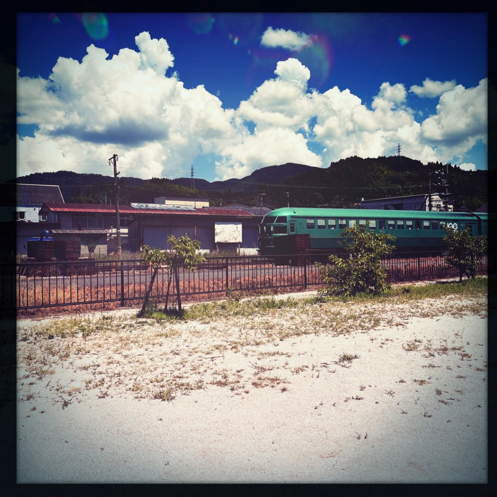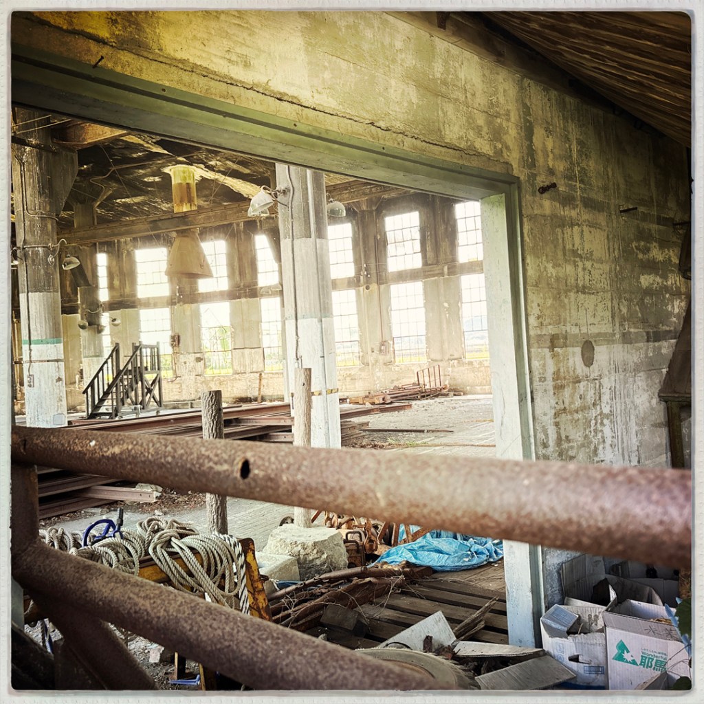 J’avais noté un truc à voir qui est sur la route, alors je mets ça dans le GPS. C’est le Bungomori Kikanko Park. Rien de fou, c’est un ancien dépôt ferroviaire, avec une plateforme tournante, qui permettait d’envoyer les locomotives à vapeur à droite, à gauche et ailleurs. Y’a une belle locomotive et la structure qui tourne, et le dépôt tout abandonné, où on ne peut pas aller. Caramba.