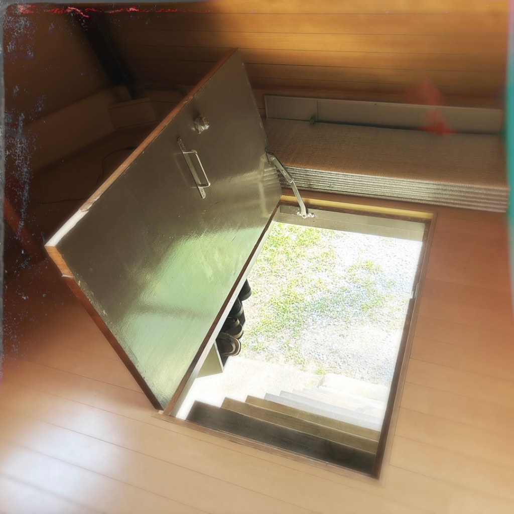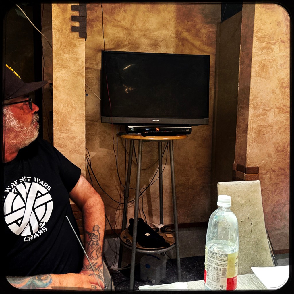 La petite pièce est pas zinzin, y’a une télé derrière Manu, tout est un peu usé. Mais allez, on est là maintenant, et on est coincé par la porte à bascule.