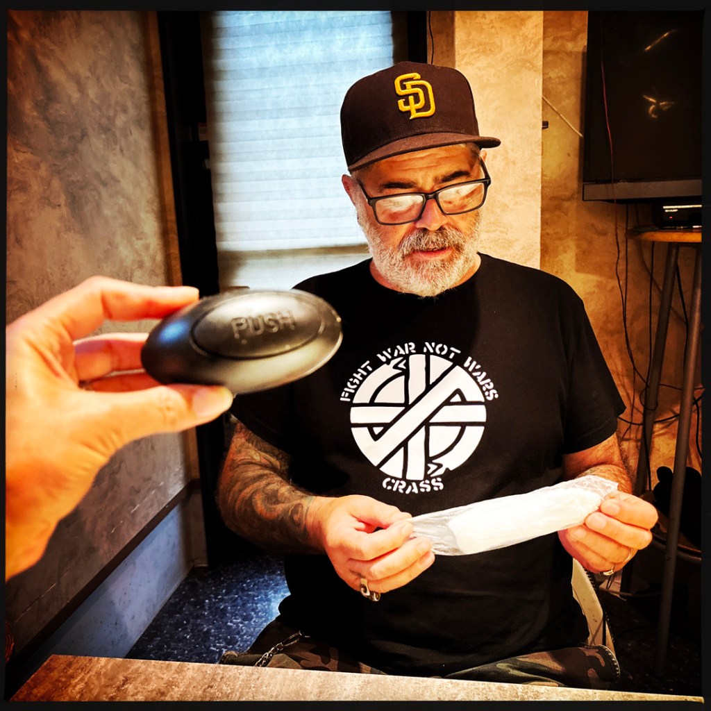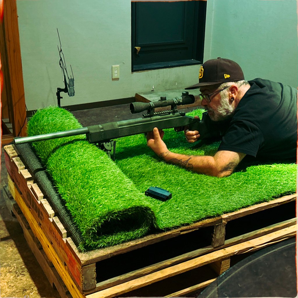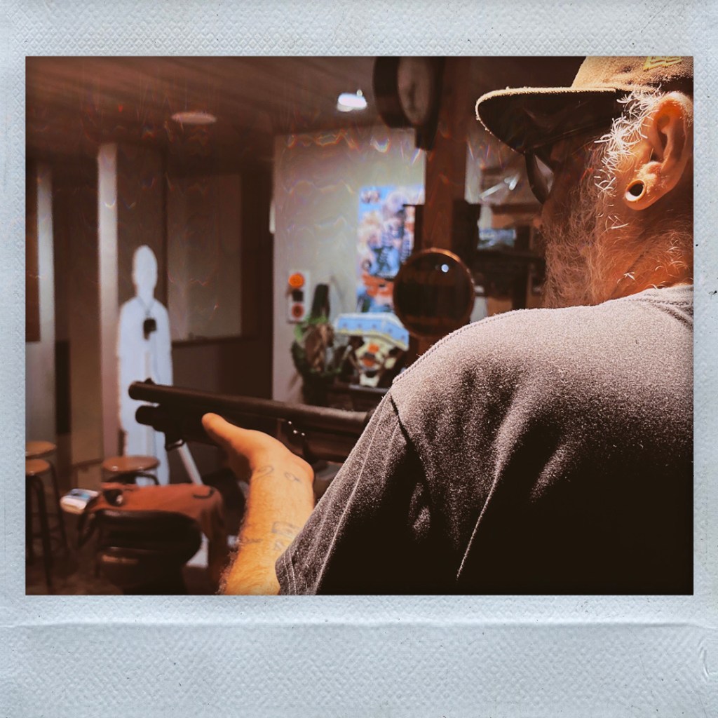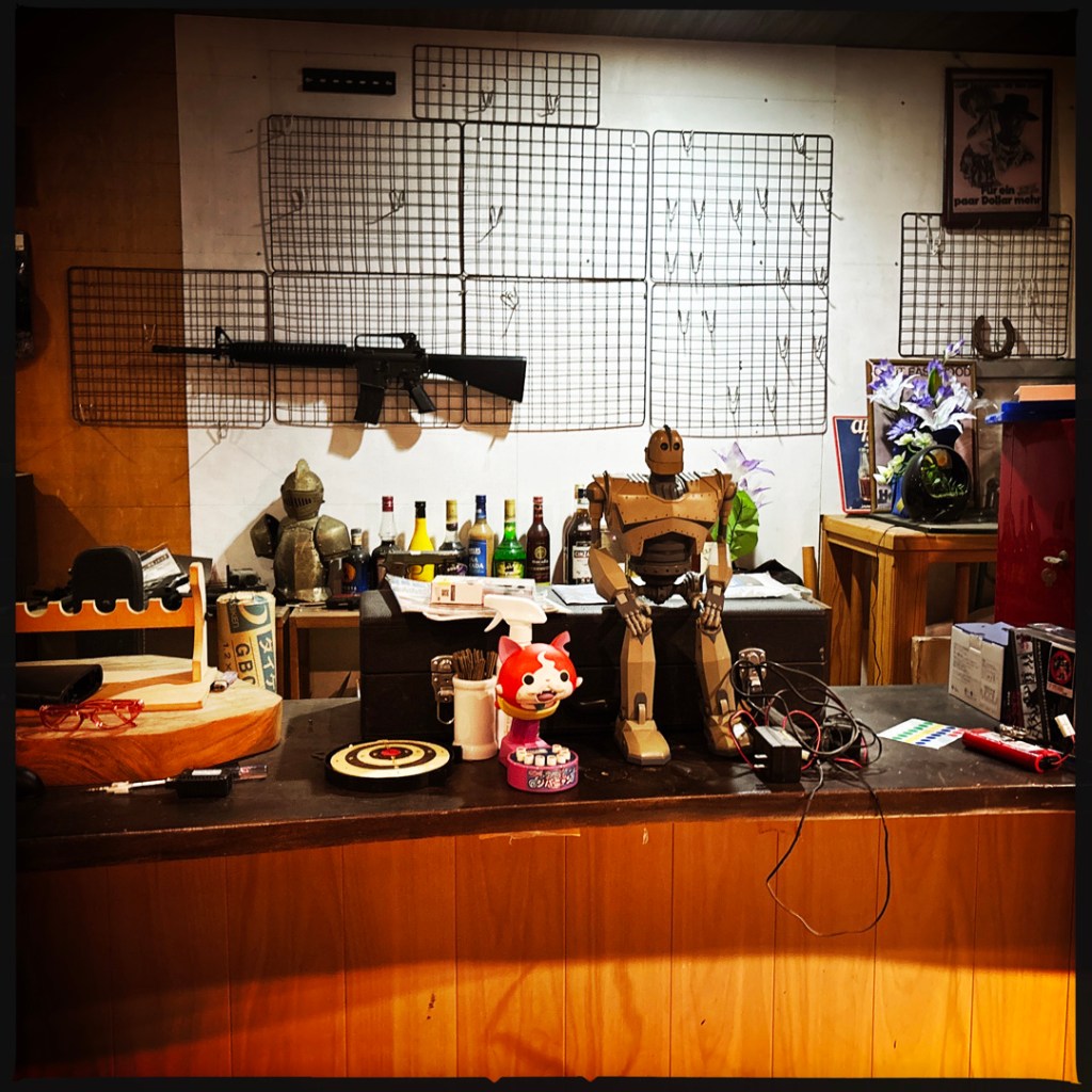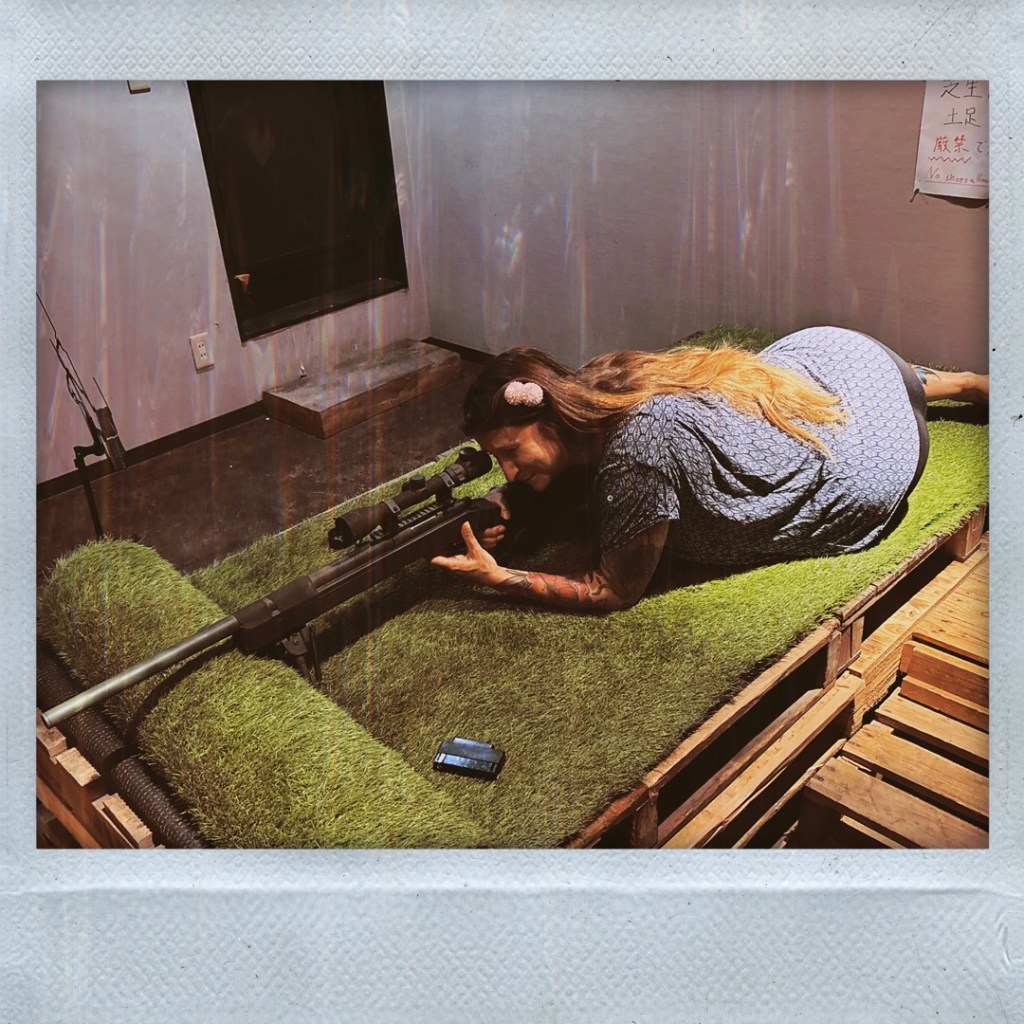 Il invite Manu à s’allonger par terre pour tirer sur les cibles à l’autre bout de la pièce. Manu procède. Puis c’est mon tour. Avec un viseur, ça va en fait. Les snipers n’ont aucun mérite (hum). Il sort une autre arme, un genre de mitraillette, il me la met dans les mains, mais oh mince y’a plus de batterie. Il est super désolé. Alors une autre arme, avec un pointeur laser. Je tire sur des canettes et je fais tout tomber. Au tour de Manu. On se regarde avec des gros yeux. On ne sait plus très bien quoi faire de cette situation. C’est assez bref finalement. On rit (un peu nerveux), on tire des billes sur des trucs inertes, ça va.