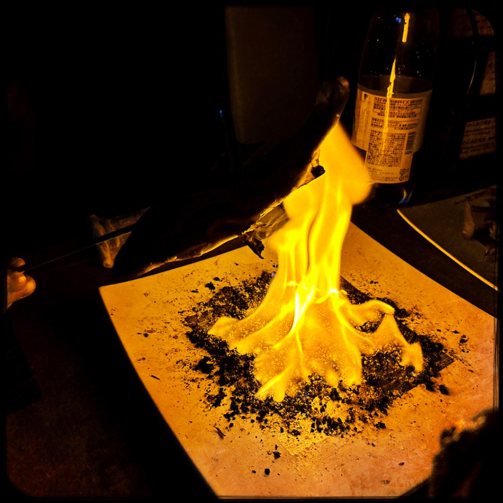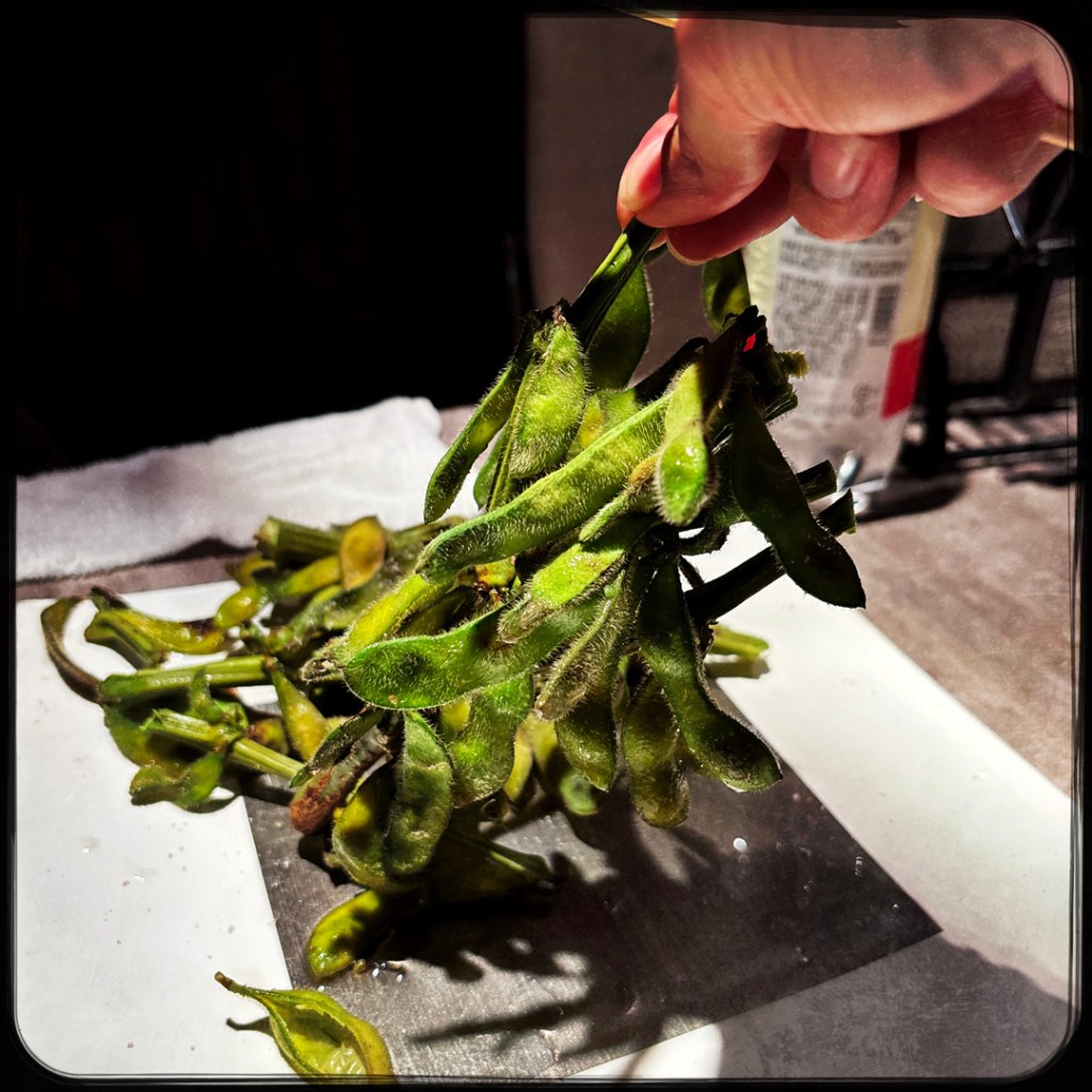 Puis, le monsieur amène une assiette d’edamames sur branche. Il crame tout ça au chalumeau et mets du sel. Quand il part, on commence à s’interroger sur ce choix enthousiaste. On s’amuse bien mais la perplexité est notre compagne de repas.