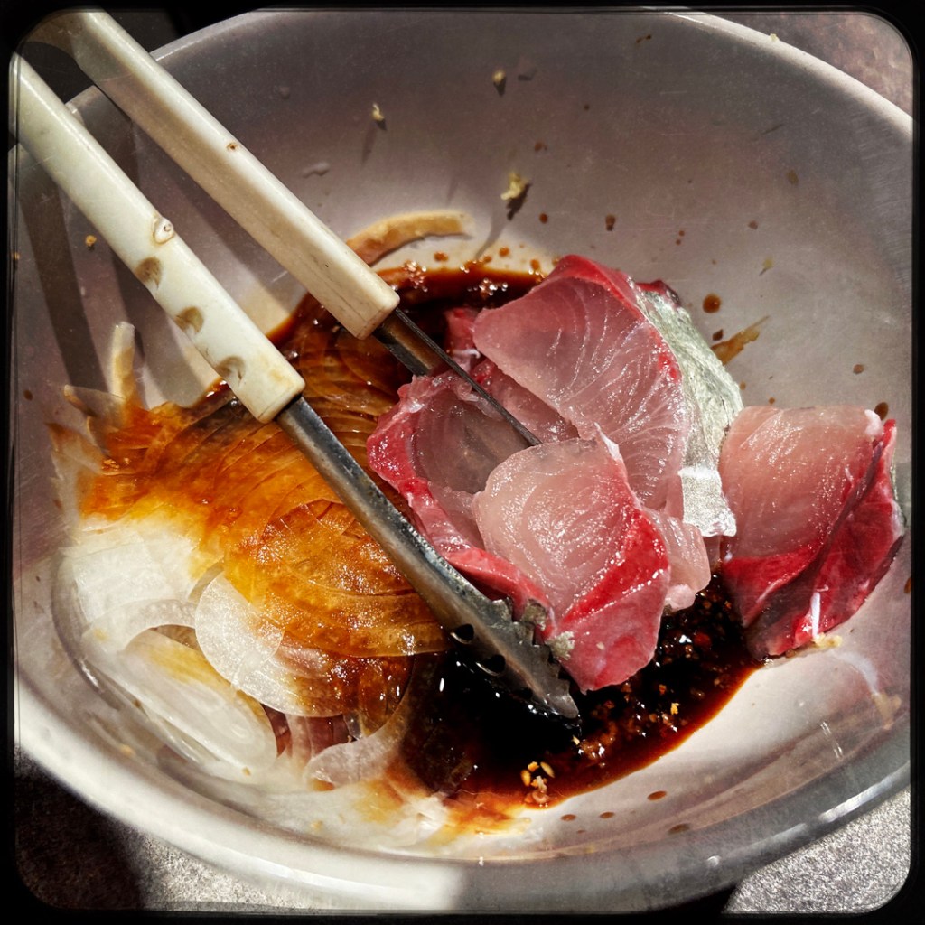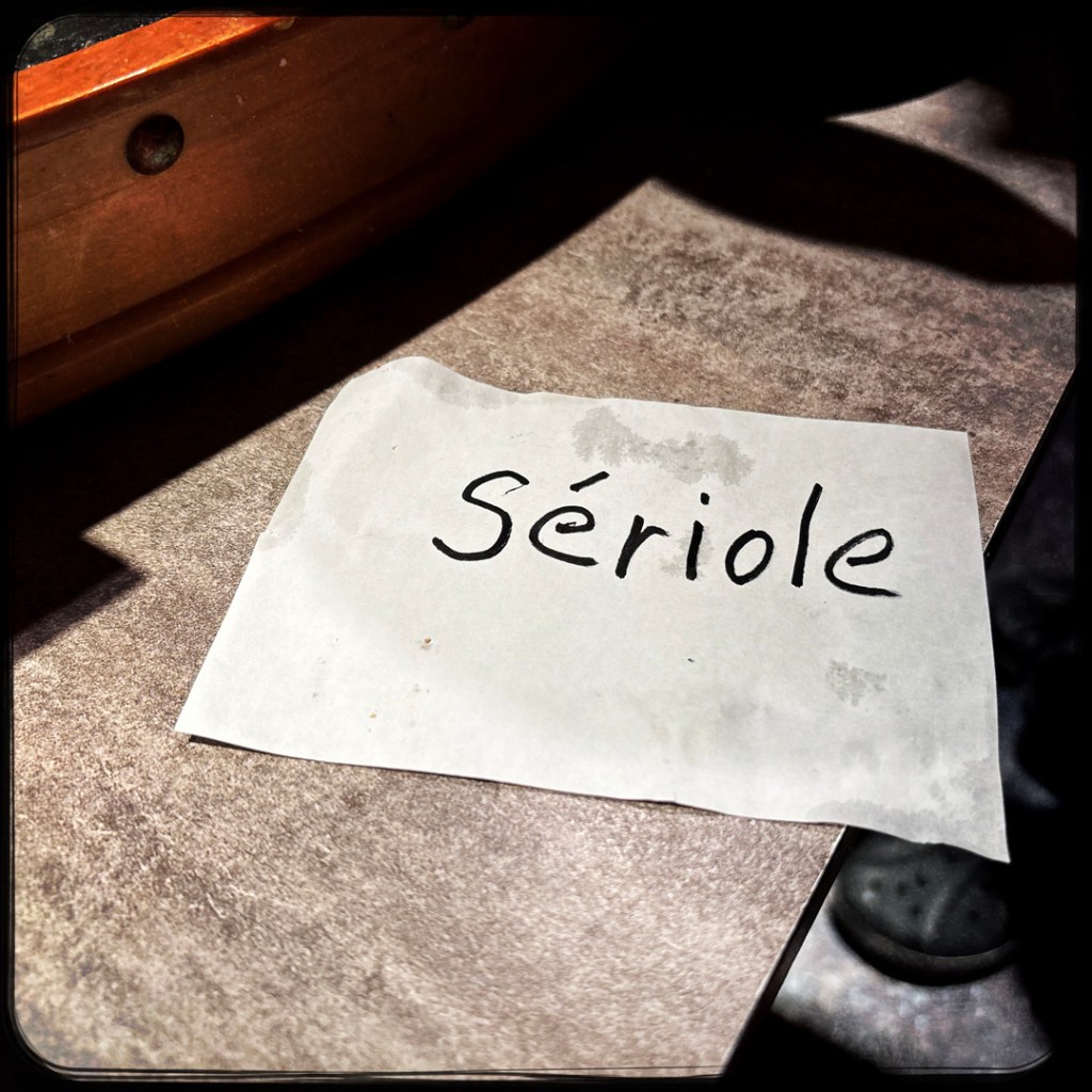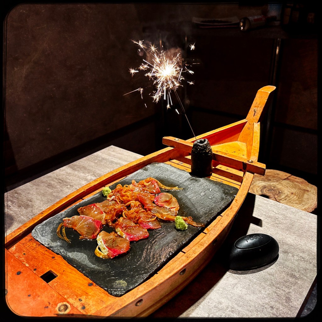 Ensuite, il revient, avec bateau en bois, dessus une plaque glacée. Il a amené un papier, avec le nom du poisson du jour et en français : sériole. Il coupe le poisson, il le met dans un bol avec un assaisonnement, et des oignons. Le tout sur la plaque, et il allume un cierge magique pour dire « C’est le timer ».