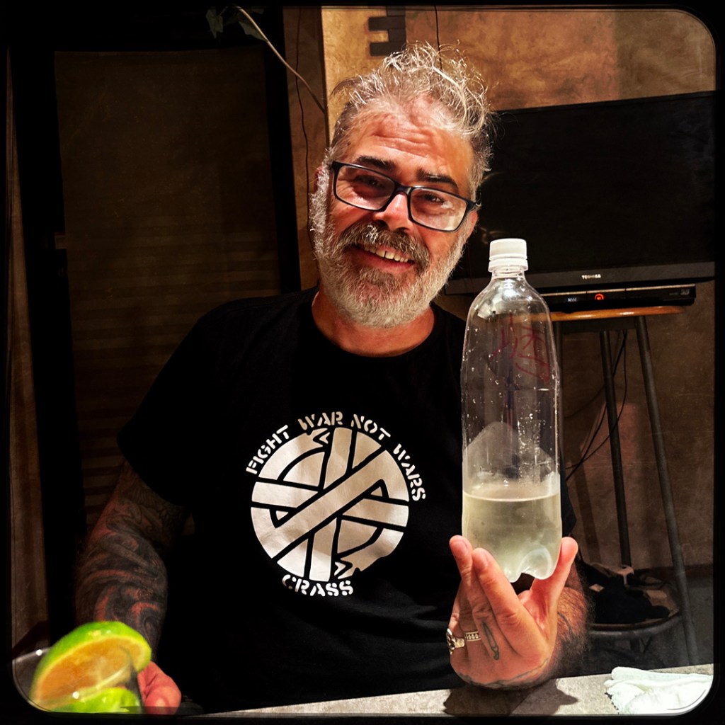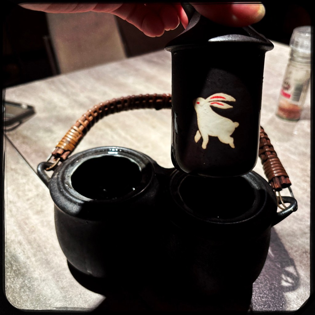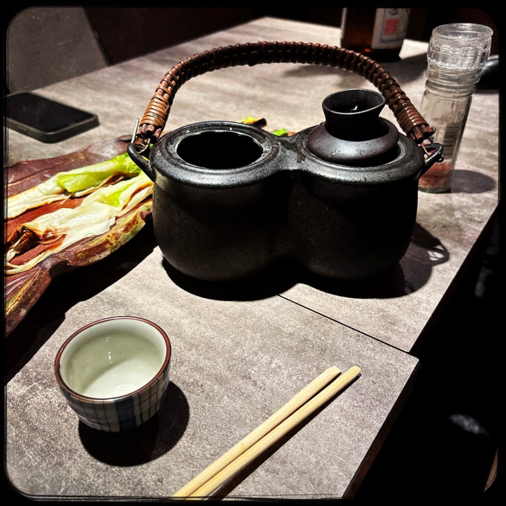Il embarque notre bouteille d’eau pétillante pas terminée, on le regarde faire sans trop comprendre. Il revient avec la bouteille de saké, la bouteille d’eau vide et un entonnoir. Il remplit la bouteille vide au quart et donne à Manu pour dire « For tonight, for you. ». Bon là, on fond total. C’est si attentionné. On arigato gozaimasu tant qu’on peut.