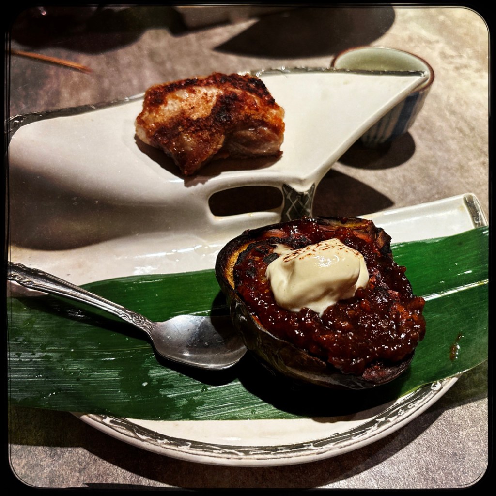 Arrive ensuite une aubergine au miso et une rib de porc. L’aubergine est géniale et on se mets de la rib plein les dents. C’est pour plus tard, pour aller avec le saké, c’est pratique.