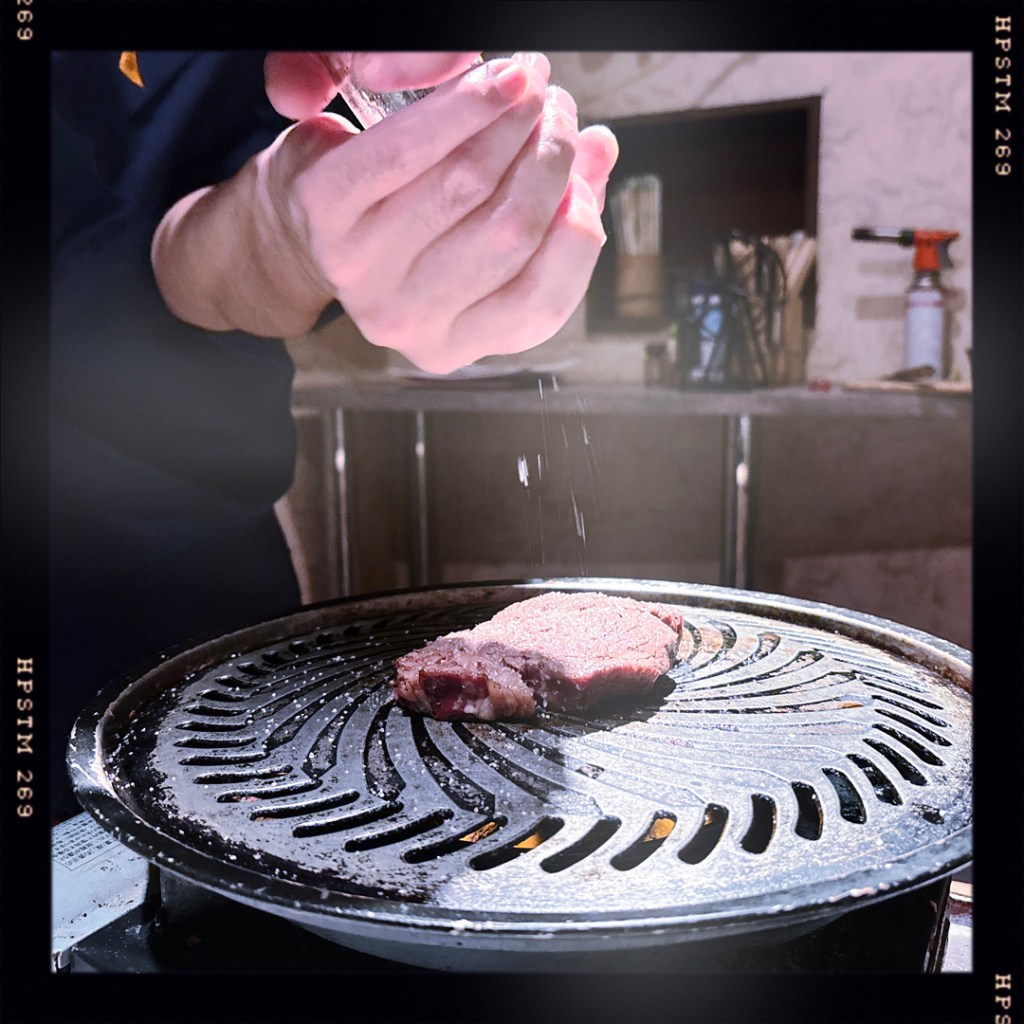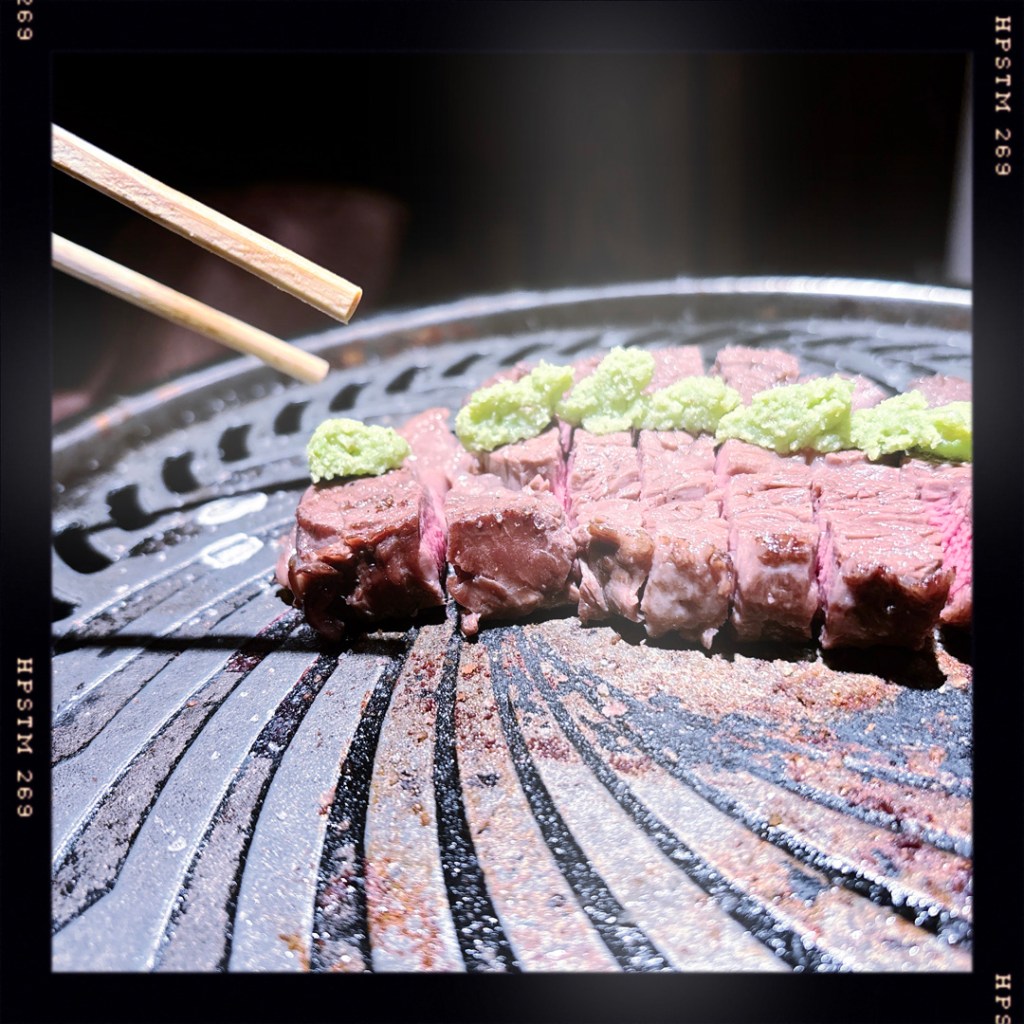 Ensuite (oui…) il amène un barbecue, et nous faire cuir un morceau de bœuf wagyu. Il met du wasabi, généreusement après la découpe. Bordel de **** c’est délicieux.