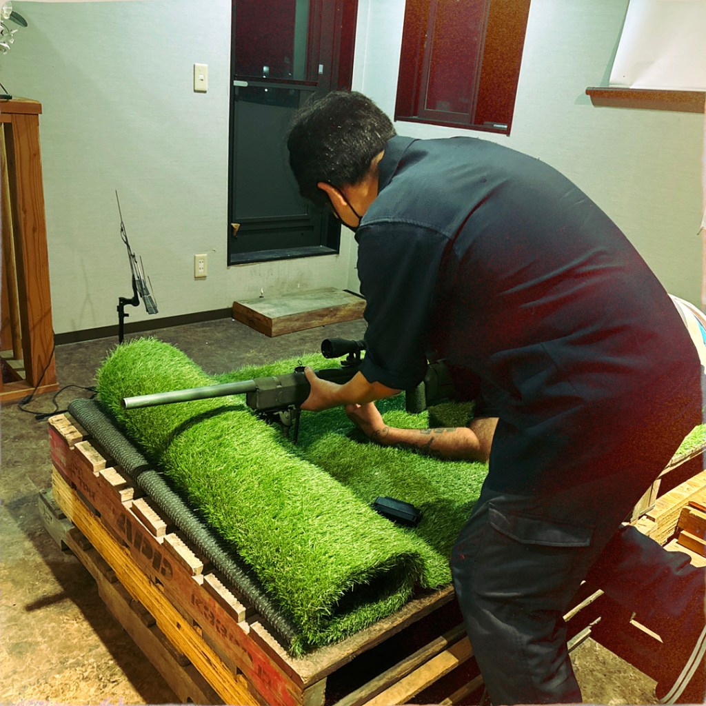 Après un aussi bon diner on ne va pas contrarier un monsieur qui aime tant les armes à feu. Toujours avec cette étrange précipitation, il nous refait signe de le suivre. On monte à l’étage. Une grande pièce, avec des jouets, des peluches géantes, et par terre, au fond de la pièce, un tapis de faux gazon, et un fusil à billes.