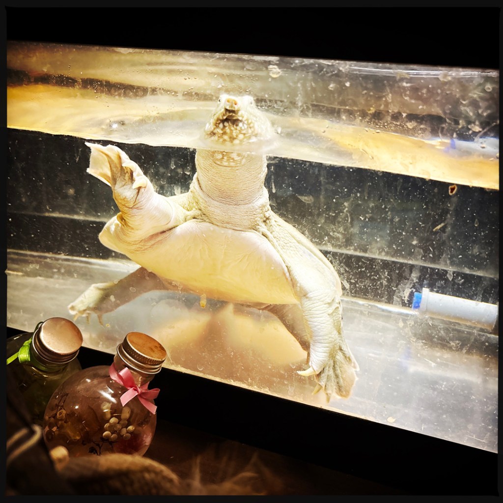 Il nous fait redescendre, et je vois une tortue aquatique, alors je fais mougnougnou à l’aquarium. Alors il court chercher un bout de poisson, qu’il attache au bout d’une corde pour que je joue à « la queue du mickey » avec la tortue. Je ne tire pas sur la ficelle, je la laisse manger son poisson peinard, avec sa drôle de tronche de tortue mouillée.